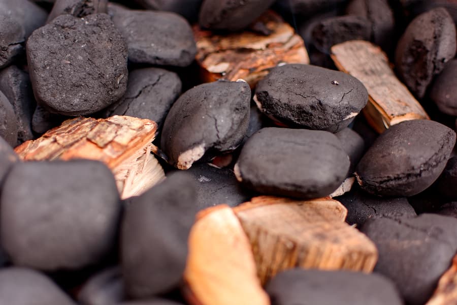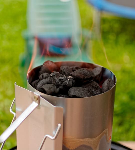 Сначала мы наполнили чашу угольными брикетами, разместив несколько веберовских чурочек для копчения на некотором удалении от центра. Затем разожгли угли в середине. Они разгорятся — и чурочки задымятся, пропитывая ароматом копчения приготовляемые продукты.