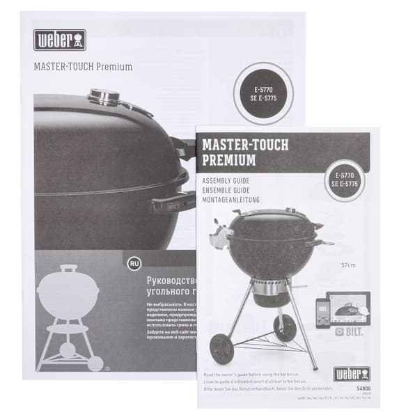 Фирменная упаковка Weber Master-Touch Premium GBS E-5770, как и в случае с его предшественником — это большая тяжелая картонная коробка с наименованием производителя и модели, фото продукта, его краткими характеристиками.