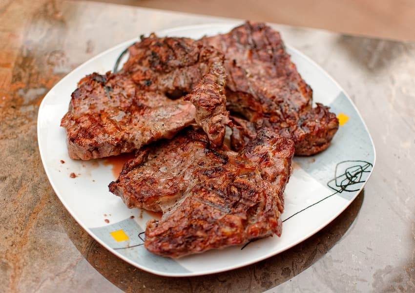 Для начала промариновали свиную шею весом в 1,5 кг в соли, смести перцев, сухой горчицы, яблочного сока и ворчестера в течение суток. Затем поместили в гриль с жароотсекателем и углем с буковыми чурочками.