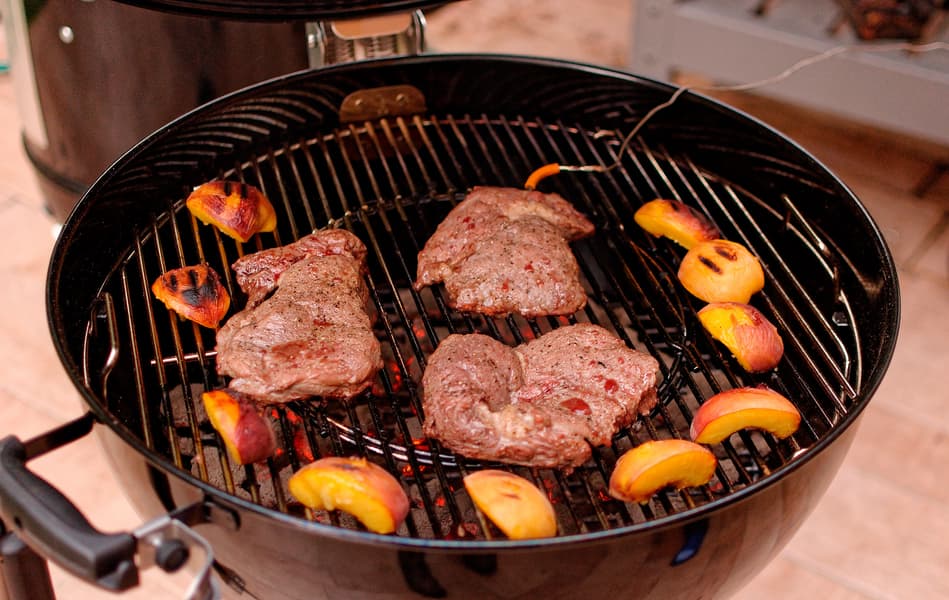 Мясо получилось зажаренным сверху и нужной прожарки (мы делали медиум) внутри. С таким грилем, да еще и под контролем термометра, и не могло быть иначе. Персики же оказались гастрономической неожиданностью для большинства дегустаторов — и отличным гарниром для стейков.