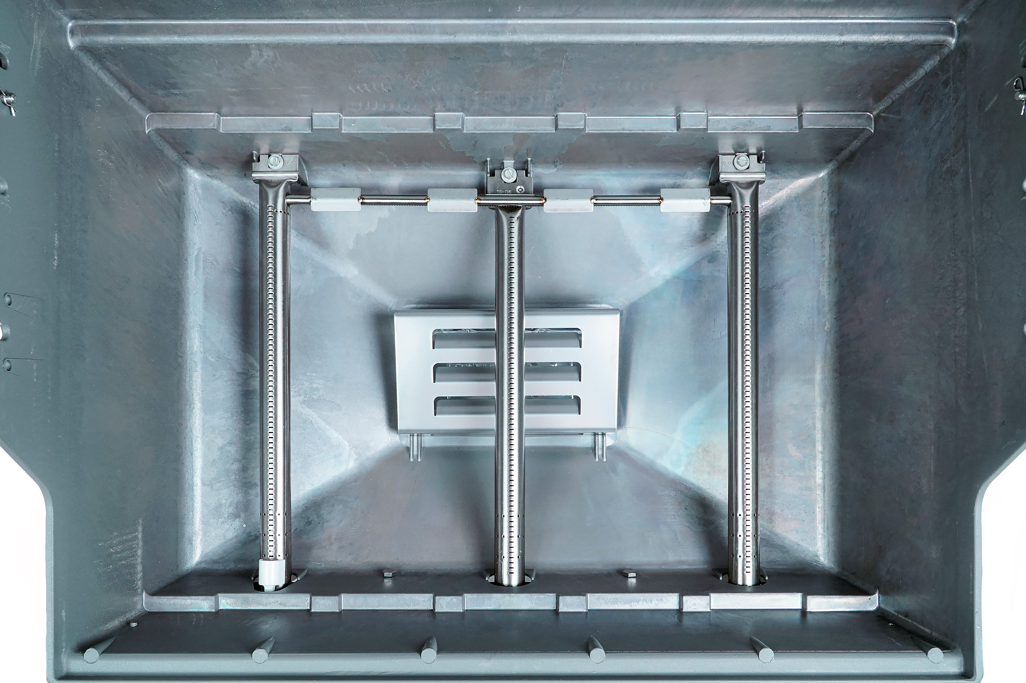 Под решеткой расположены 5 элементов, которые Weber называет Flavorizer Bars — «ароматические пластины». Они сделаны из эмалированной стали и расположены над горелками (три) и между ними (две). Попадая на эти пластины, мясные соки и жир испаряются, создавая «тот самый аромат барбекю».
