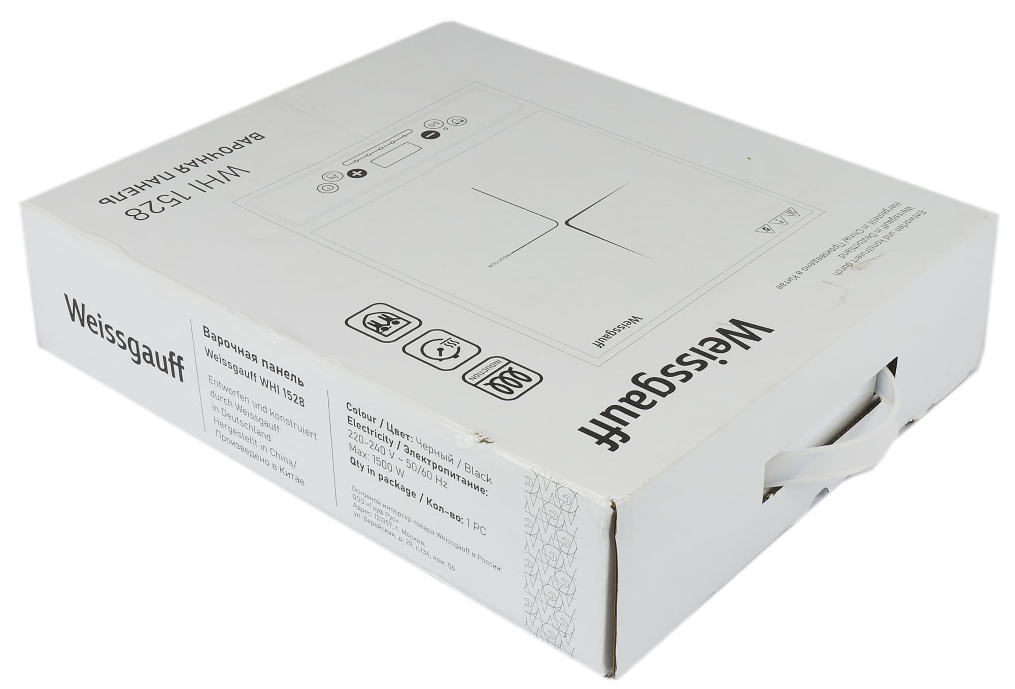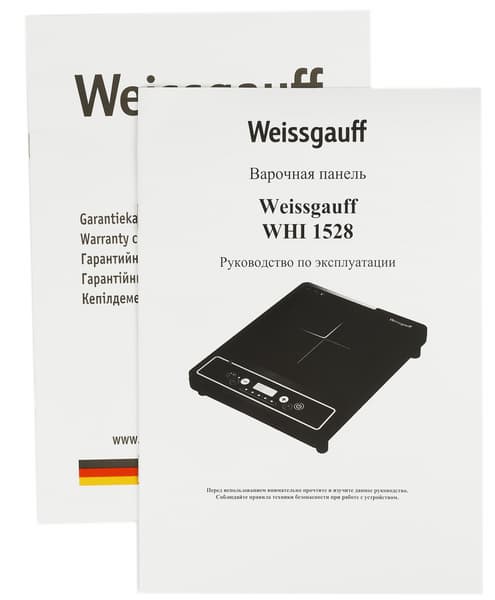 Индукционная плитка Weissgauff WHI 1528 поставляется в небольшой компактной коробке. Лаконичное оформление упаковки содержит схематическое изображение прибора, полное название модели и краткое описание ее технических характеристик. Для удобства переноски на коробке предусмотрена пластиковая ручка.