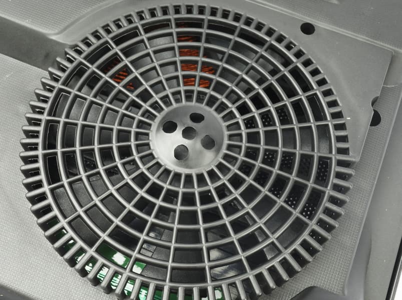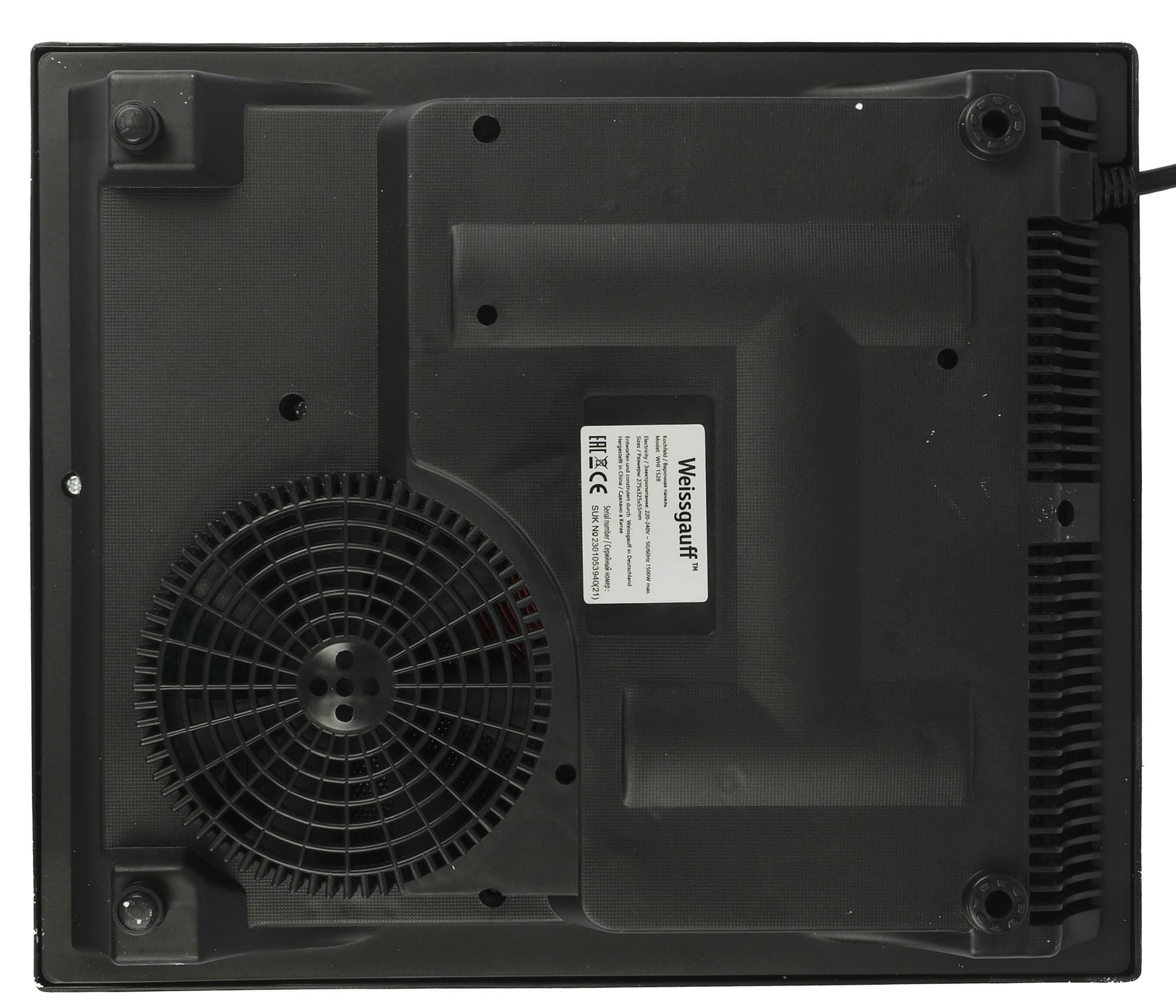 На поверхности стола плитка устойчиво располагается благодаря четырем ножкам с противоскользящими накладками. На дне прибора размещены вентилятор, и наклейка с технической информацией.