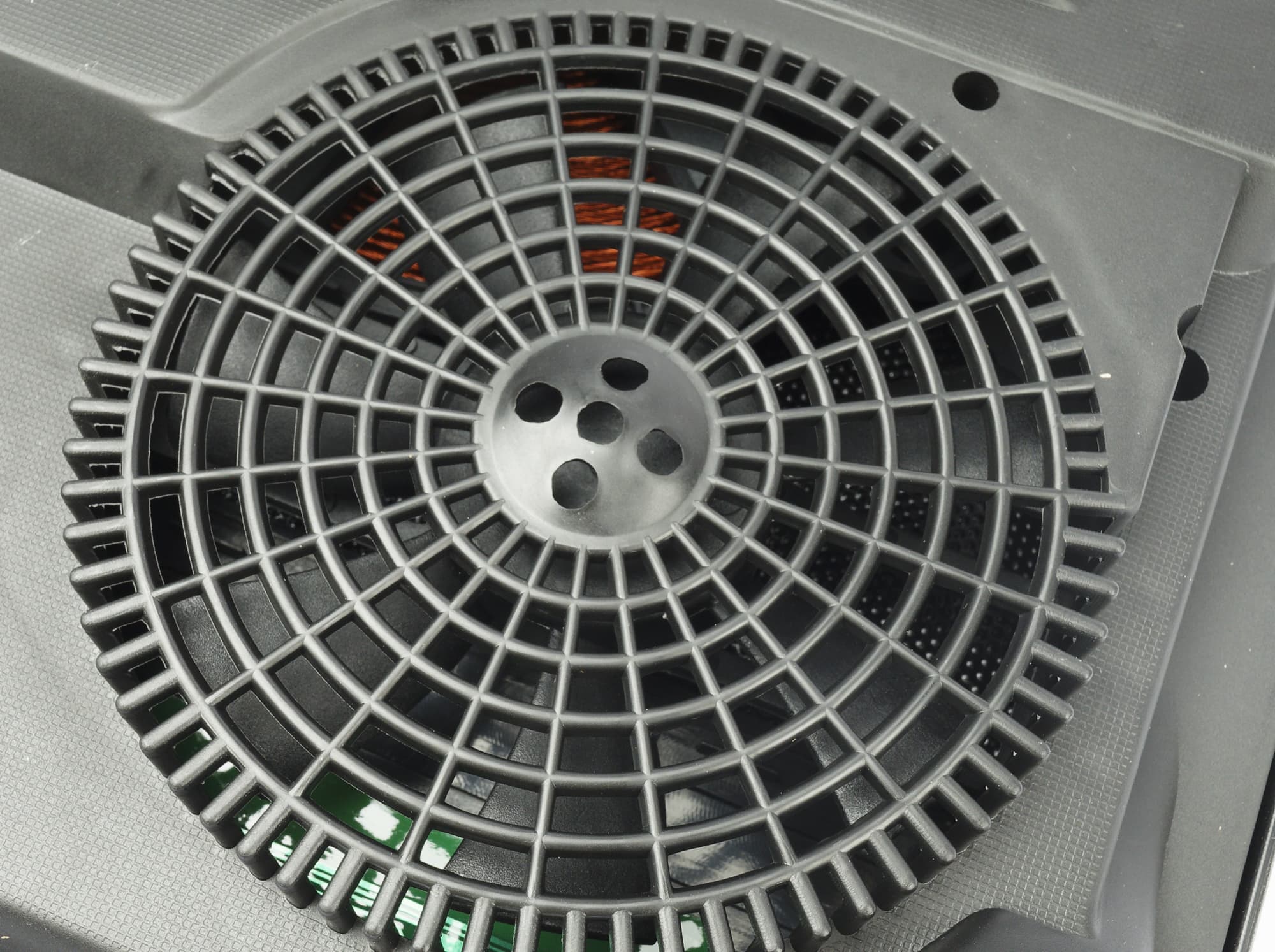 Ближе к задней стенке мы также видим ряд вентиляционных прорезей и место выхода шнура электропитания длиной 1,5 метра. Шнур оснащен вилкой.