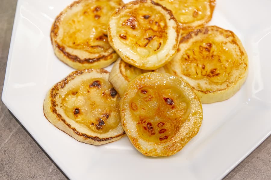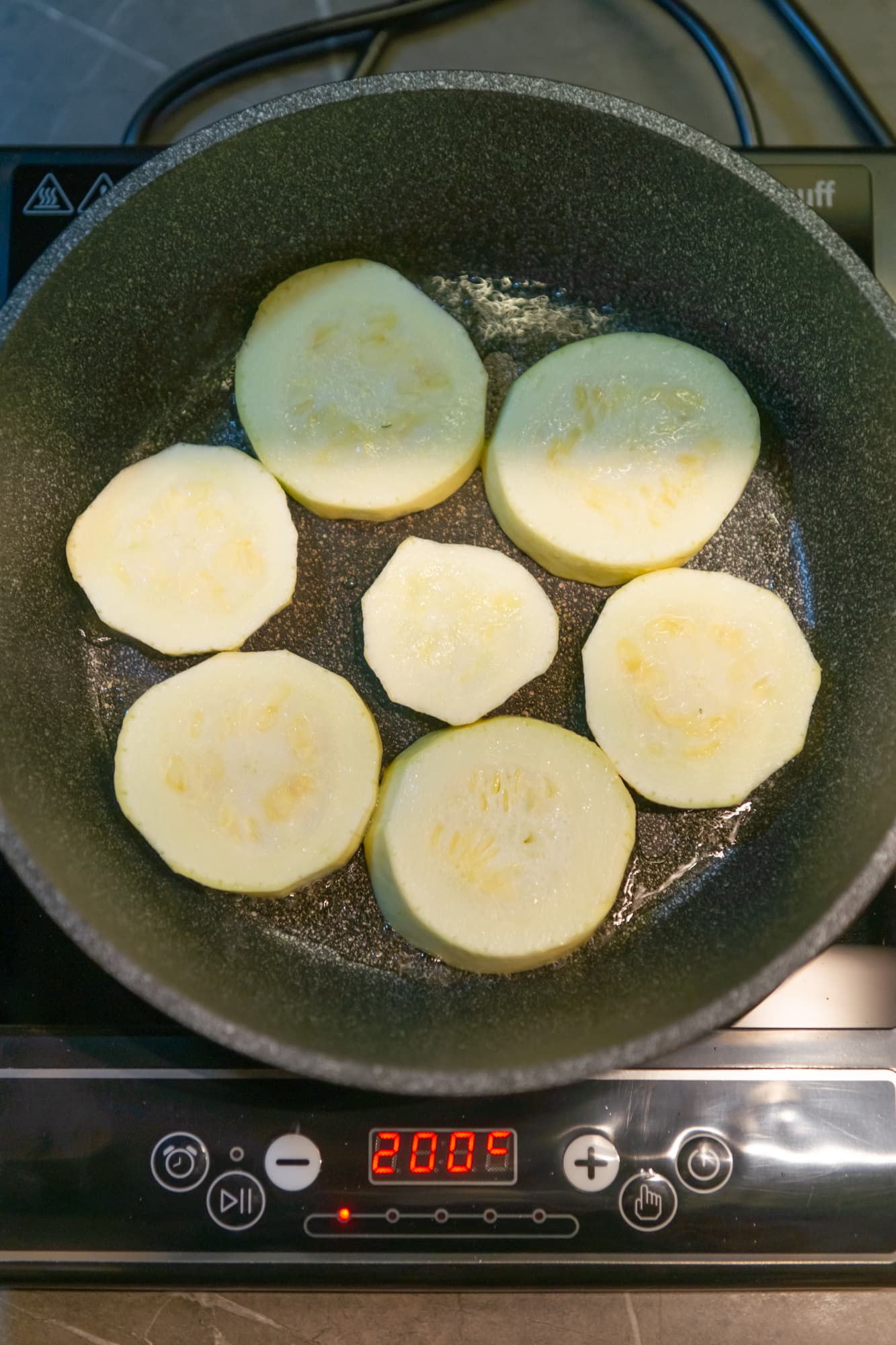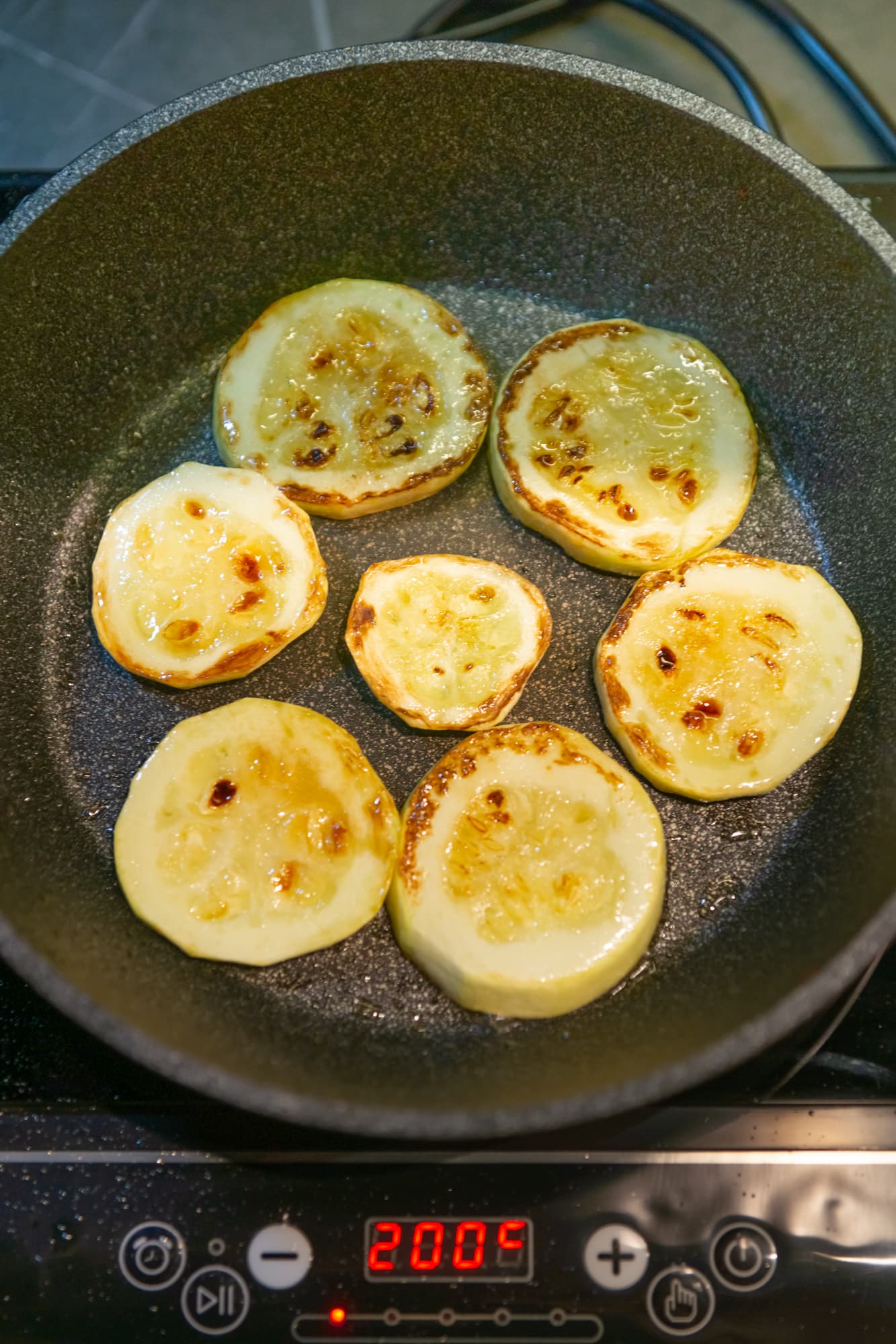 Для того чтобы сравнять загар, мы пару раз поменяли кусочки местами. В целом, это нормальная ситуация, учитывая, что диаметр зоны нагрева меньше дна сковороды, так что считать это за минус не будем. Тем более, что внутри ни один кружок кабачка сырым не остался.