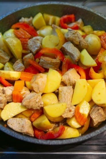 Спустя минут 10 присоединили к ним картошку, перцы, посолили, добавили специй, всё перемешали и влили немного воды. Снова закрыли крышкой и оставили тушиться при 90 °C. Пару раз в процессе перемешали содержимое. Через 25 минут блюдо было готово.