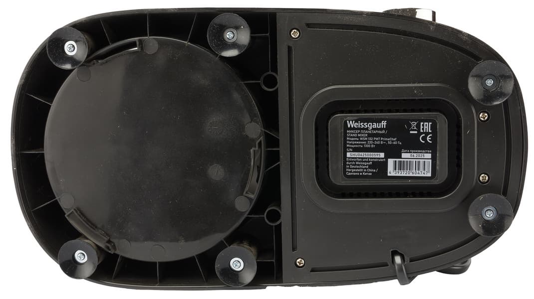 Производитель обещает, что шестерни, выполненные из высококачественной стали, медная обмотка и встроенная защита от перегрева обеспечат долговечность, защиту от коррозии и повреждений даже при интенсивной и продолжительной работе. И после знакомства с Weissgauff WSM 132 PMT мы склонны верить в его продолжительную работоспособность, ведь прибор без труда замешал нам три вида теста, одно из которых было тугим и неподатливым. Устройство не буксовало и без устали вымешивало его почти 6 минут, немного пошатываясь от напряжения, но при этом не сдвигаясь с места за счет ножек-присосок.