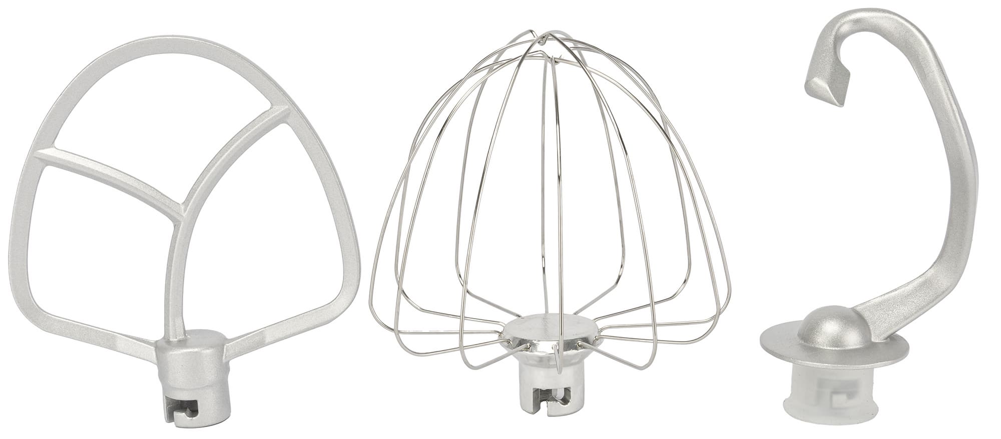 В комплекте идут три насадки: венчик для взбивания, крюк для замешивания теста, насадка для смешивания мягких продуктов. У венчика 6 стальных дуг, крюк и насадка для смешивания силуминовые.