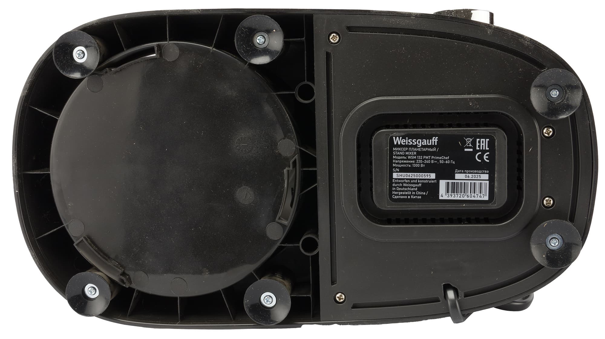 Конструкция Weissgauff WSM 132 PMT классическая — неподвижное основание с гнездом для крепления дежи, откидная часть с валом для крепления насадок и рычажок блокировки откидной головки в нижней правой части корпуса. Высота устройства — 32,5 см, диаметр чаши сверху — 24,5 см.