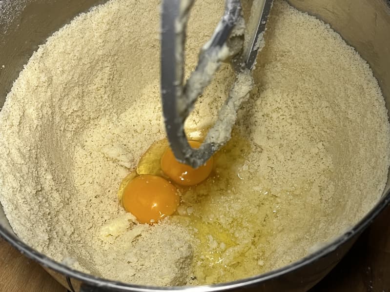 Добавили яйцо и яичный желток к тесту и включили миксер еще на 1 минуту.