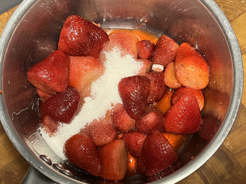 А тем временем взялись за приготовление начинки. Для этого сложили клубнику в кастрюлю, добавили сахар и отправили вариться на медленном огне.