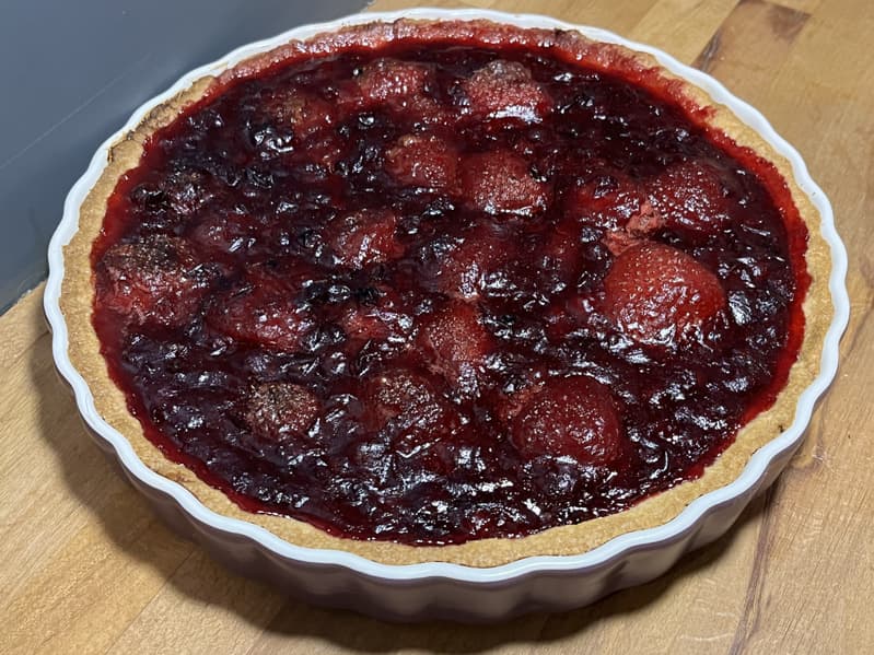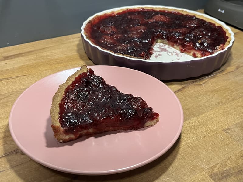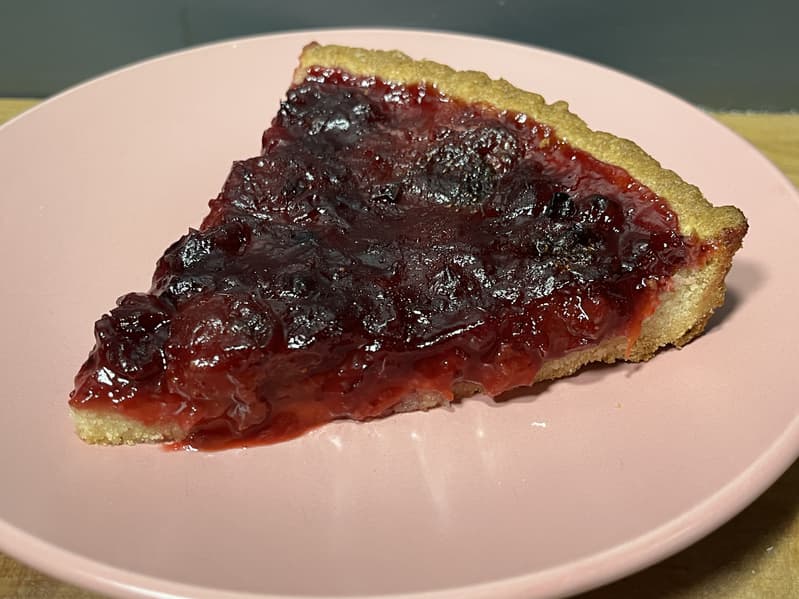 Когда пирог остыл, мы разрезали его и подали к столу. Сочетание клюквы и клубники в начинке оказалось очень гармоничным, а вместе с песочным тестом — безупречным.