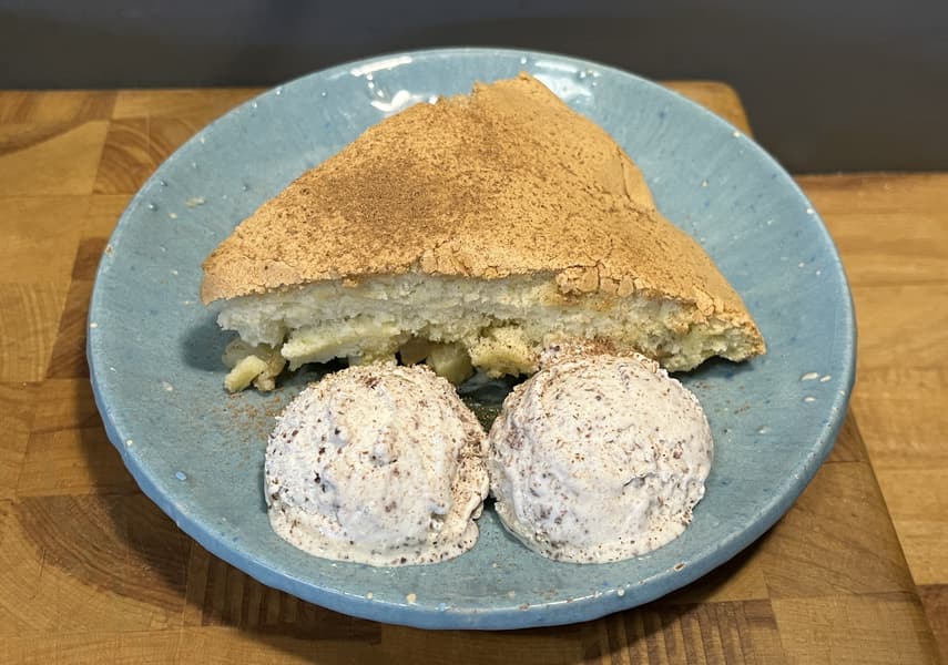 Потому что ароматная шарлотка с двумя шариками мороженого просто обязана быть горячей. Сверху посыпали наш десерт корицей.