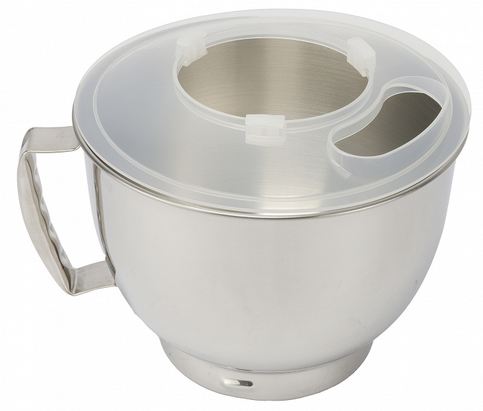 Округлая дежа объемом 4,5 л выполнена из нержавеющей стали и имеет удобную широкую ручку. Ко дну она сужается и на получившейся ступеньке имеются 3 небольших объемных выступа, благодаря которым она крепится посредством байонетного соединения в основании корпуса.