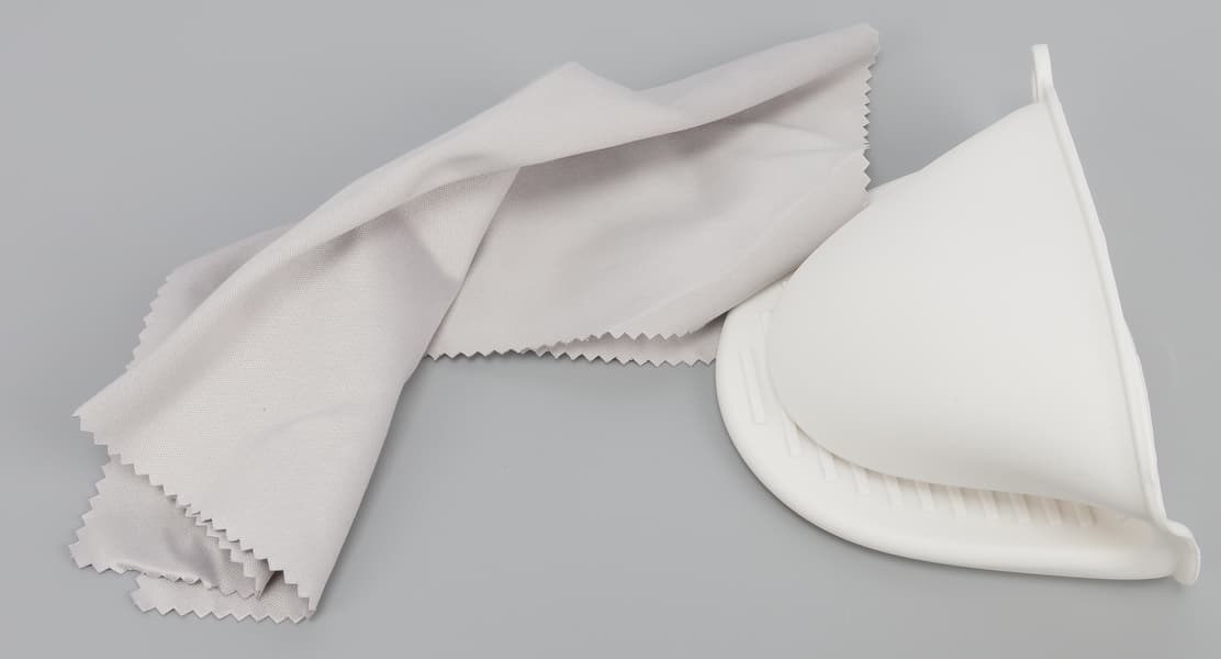Чтобы не обжечься об раскаленные металлические противни производитель позаботился об удобной силиконовой прихватке. Рядом на фото — мягкая тканевая салфетка для ухода за внешними поверхностями корпуса.