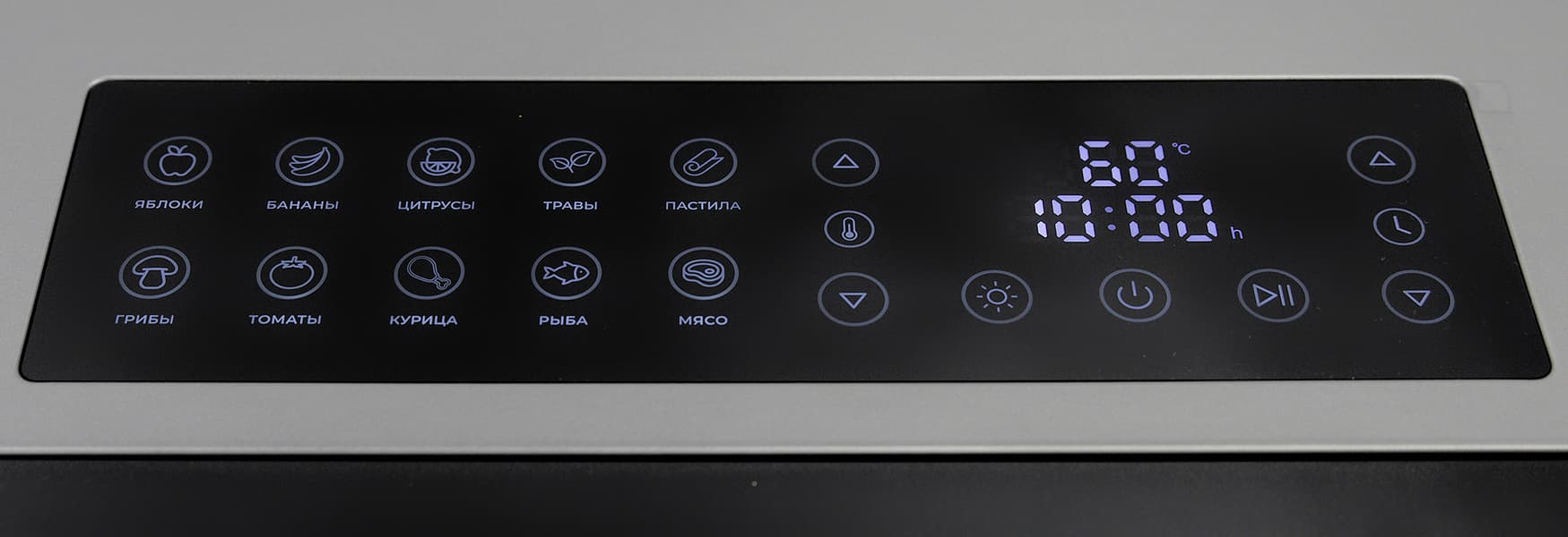 Панель управления Wollmer JD500 Sahara условно делится на две части: слева находятся сенсоры выбора авторежимов, справа — функциональные кнопки, отвечающие за настройку параметров, запуск/остановку программы, включение подсветки в камере и включение/выключение самого устройства.