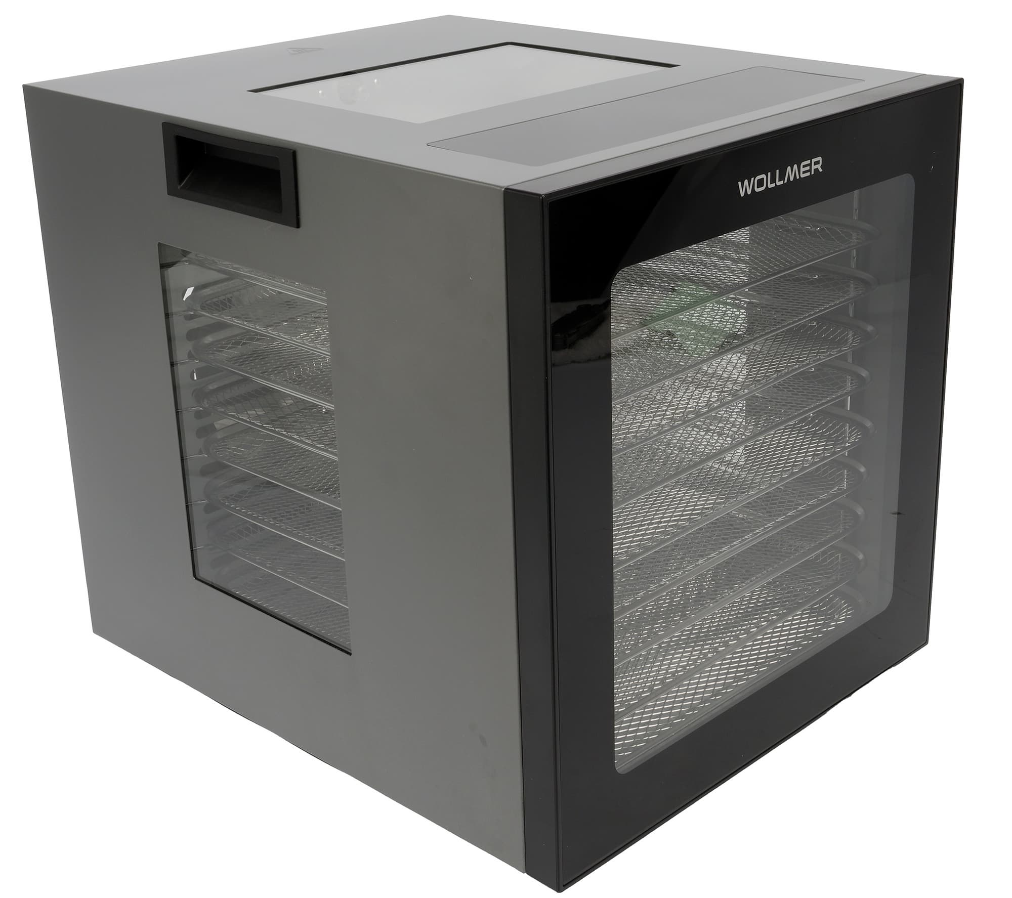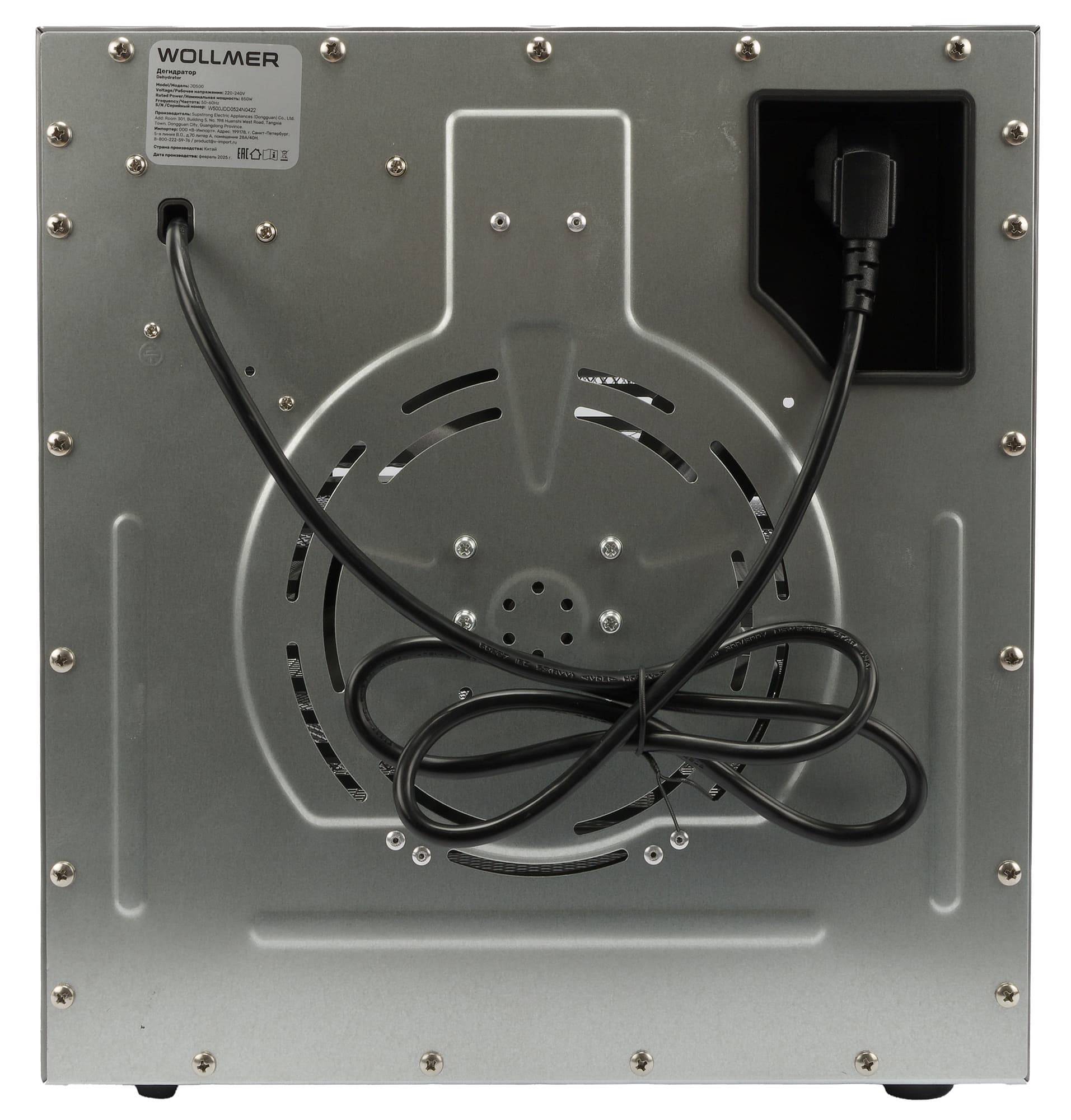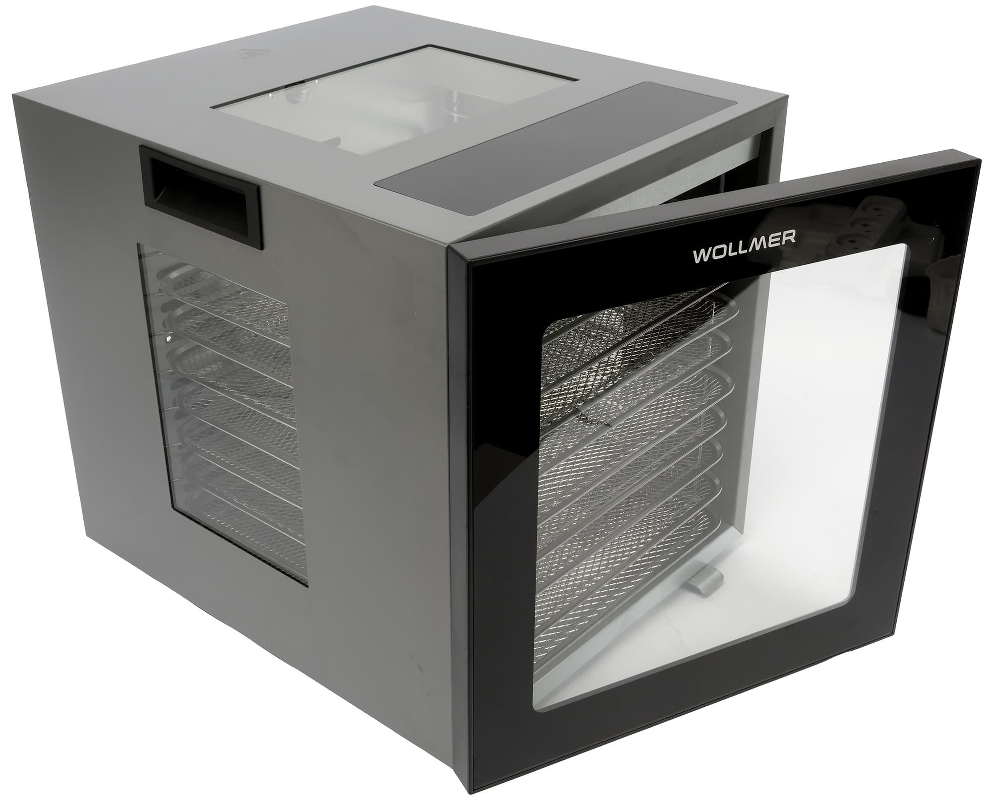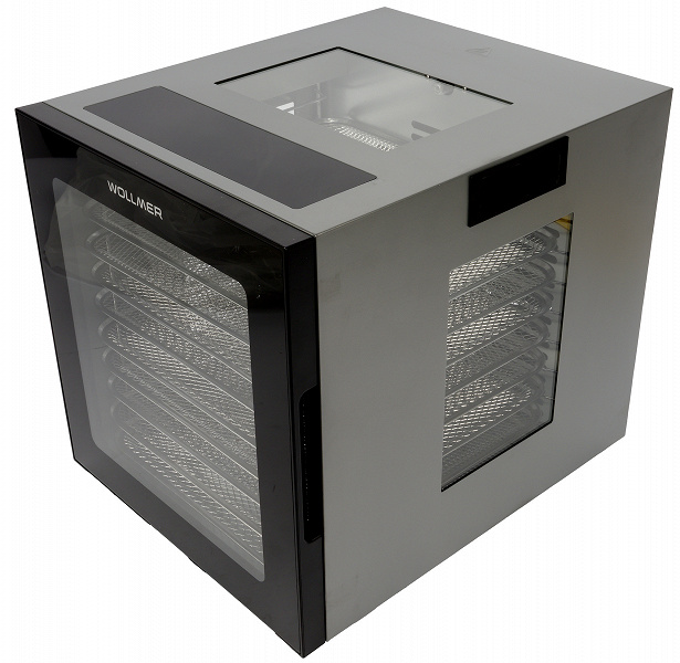 Wollmer JD500 Sahara относится к горизонтальному типу дегидраторов — тэн с вентилятором у него расположены на задней стенке, и, в отличие от вертикальных устройств, где нагревательный элемент подает горячий воздух снизу или сверху проходя последовательно через все уровни, в такой конструкции воздушный поток равномерно распределяется по горизонтали каждого из 10 поддонов, не проходя сквозь другие лотки. Теоретически, такая схема позволяет одновременно сушить разные продукты, т.к. запахи от одного не пропитывают другой.