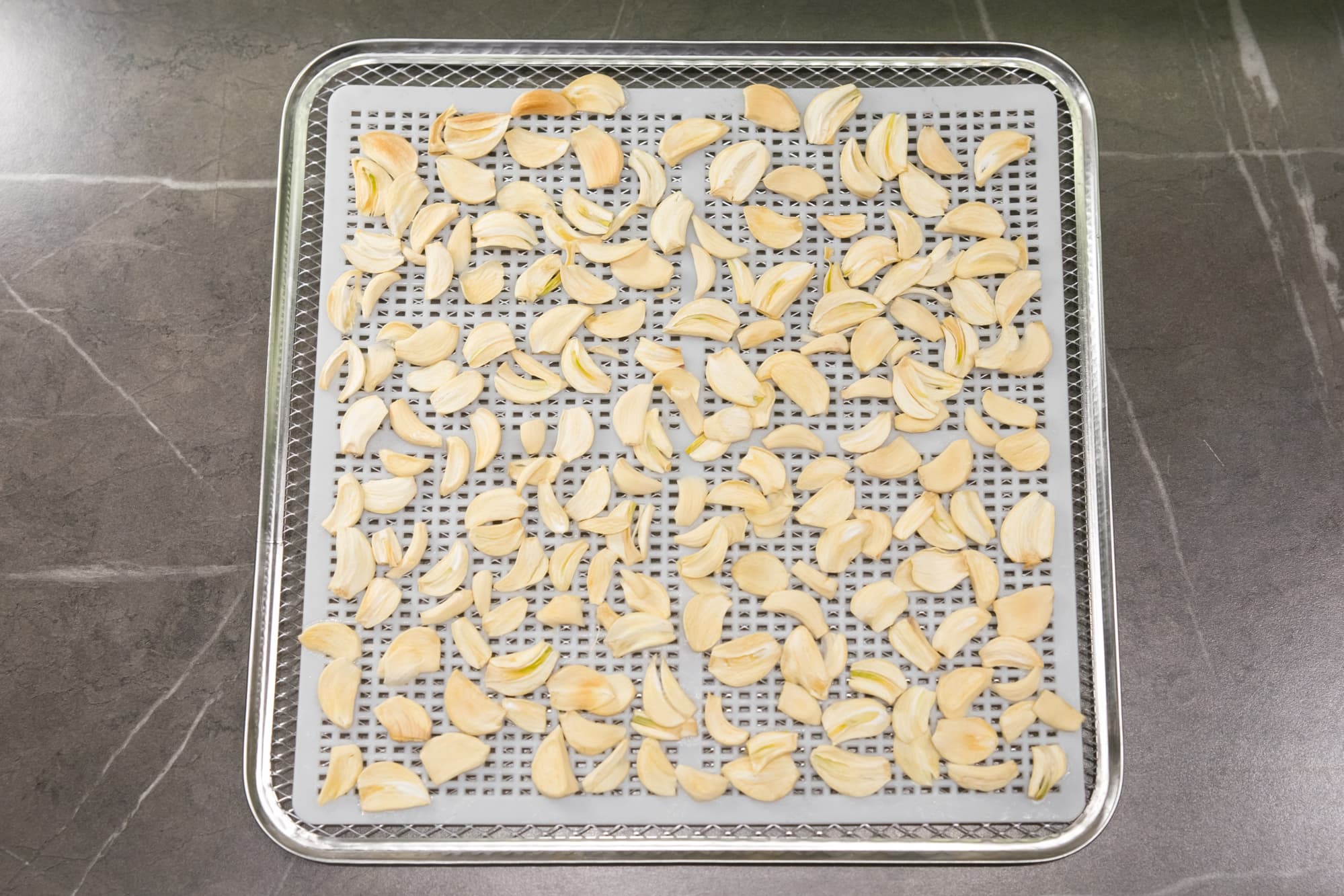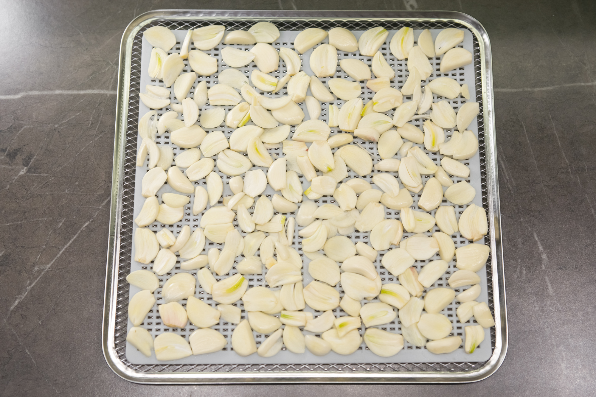 Чеснок нарезали тонкими пластинками и уложили на пластиковую сетку.