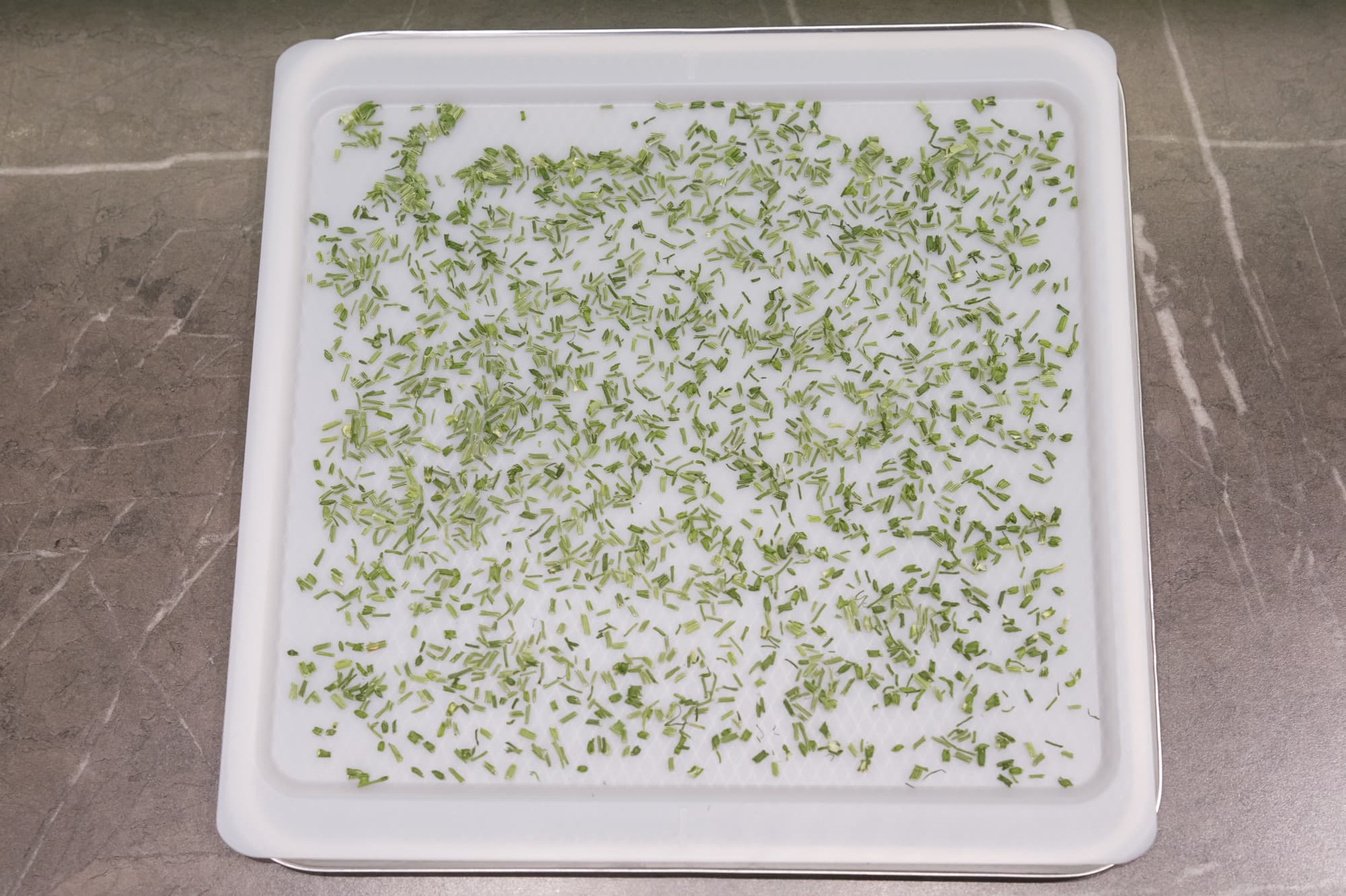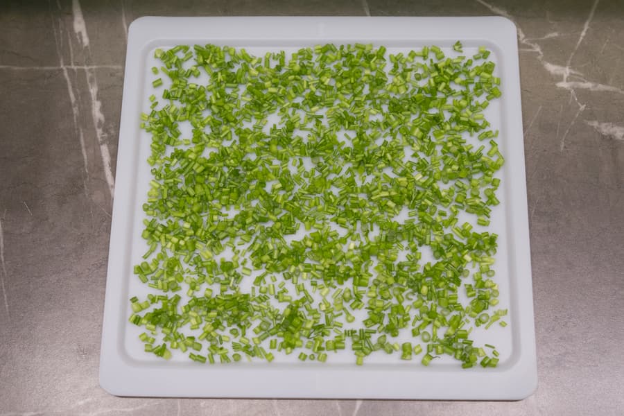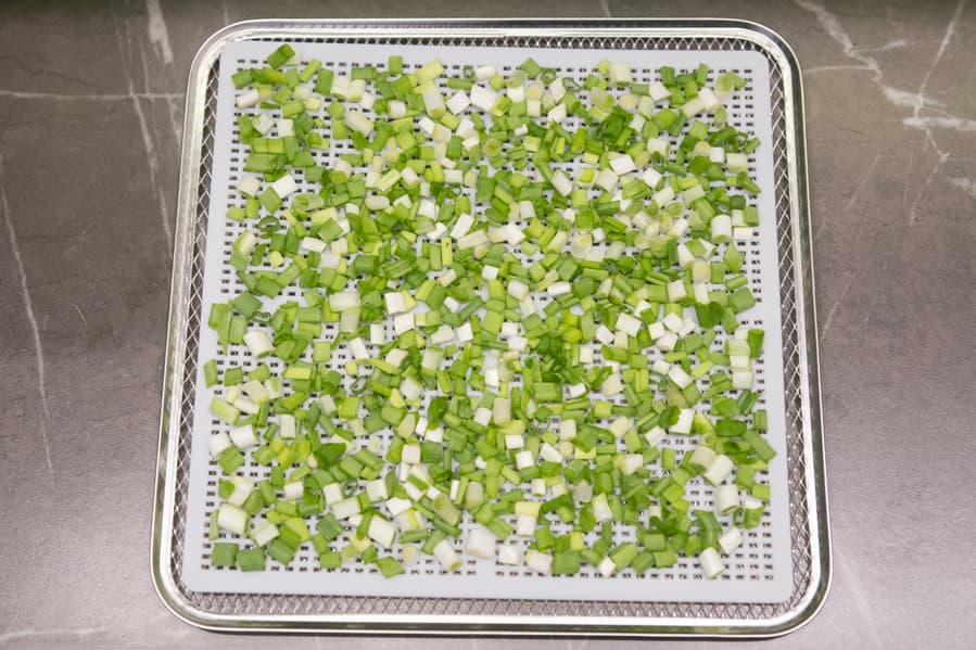 Сушка зелени происходила в авторежиме «Травы», с установленной по умолчанию температурой 40 °C. Мелко нарезанный зеленый лук разложили на пластиковые сетчатые поддоны. На одном уровне удалось разместить 100 г.