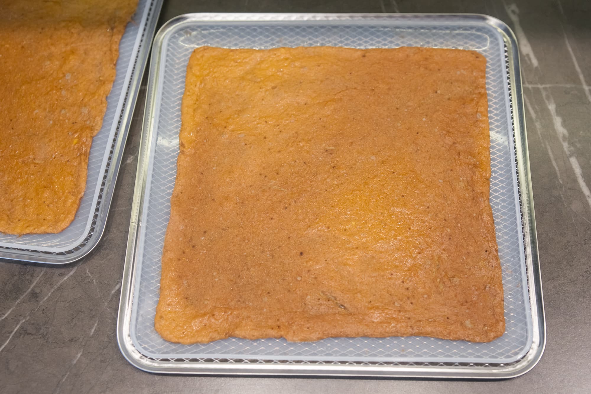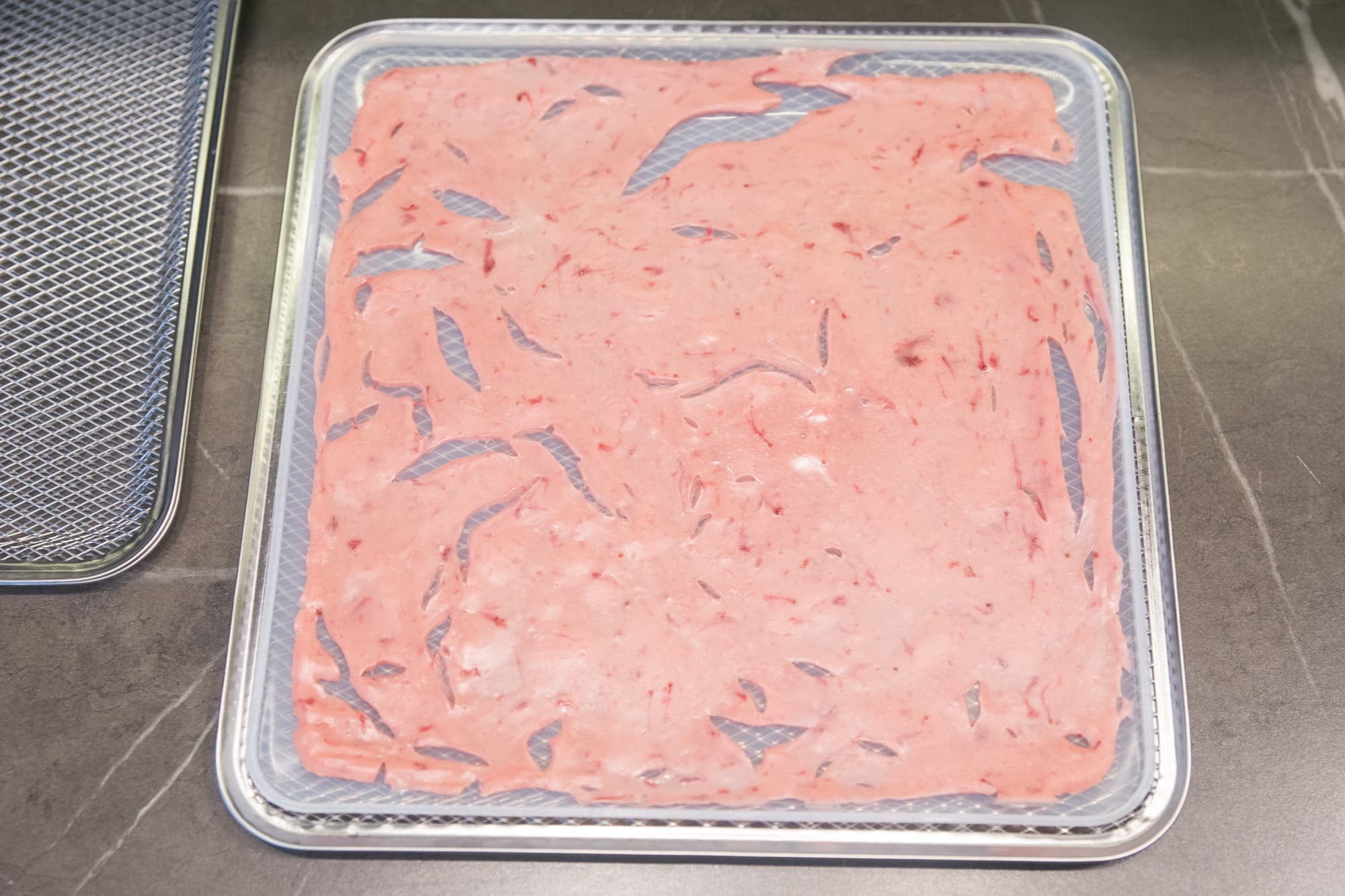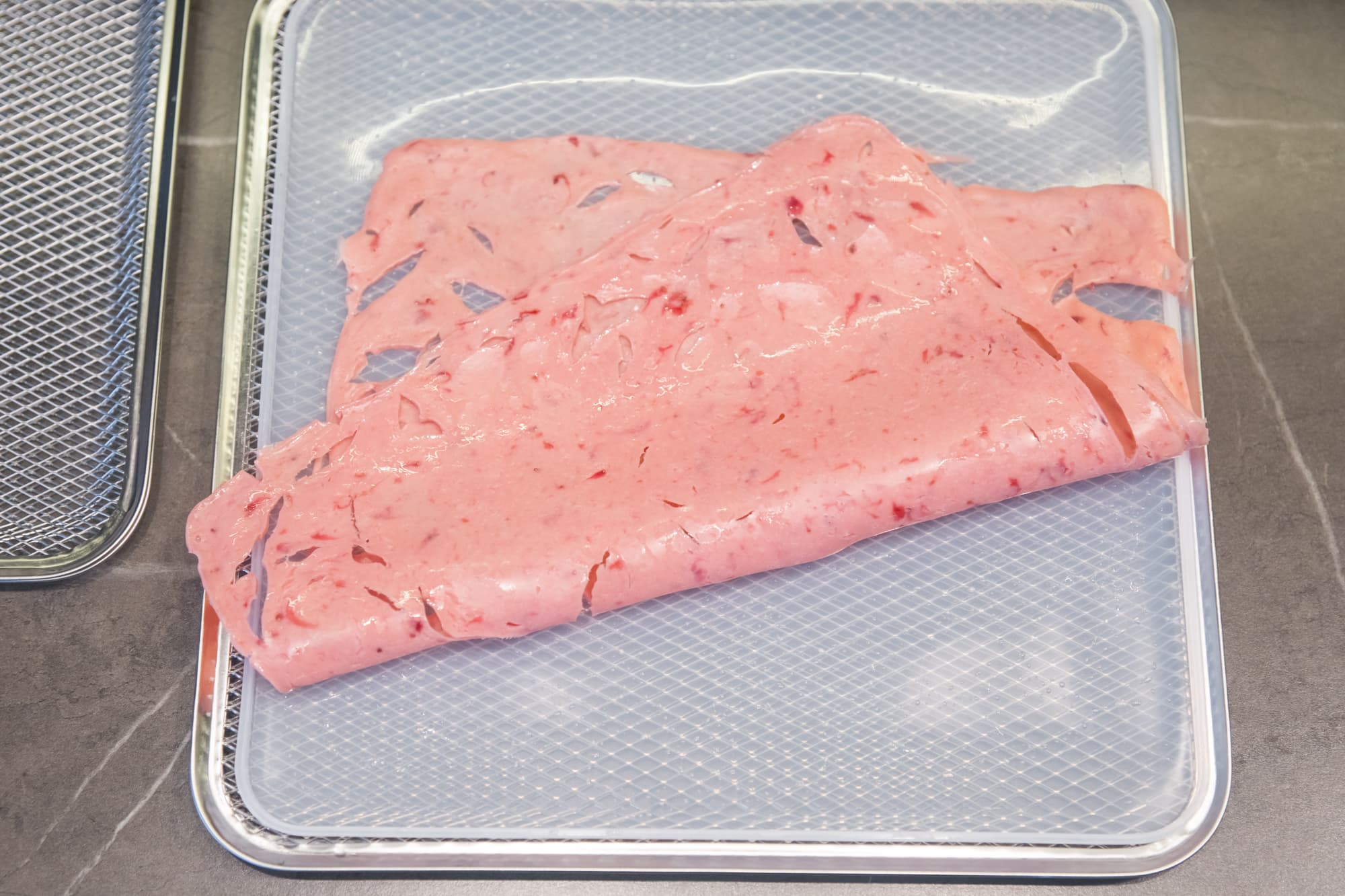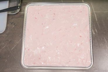 Десерт мы приготовили двух видов: из блендированных манго и бананов в пропорции 50/50 и из клубнично-земляничного густого йогурта жирностью 2,5%. Силиконовые поддоны смазали растительным маслом и равномерно распределили по нему подготовленные смеси. Дегидратор запустили на 12 часов при 60 °C.