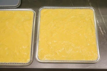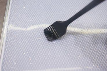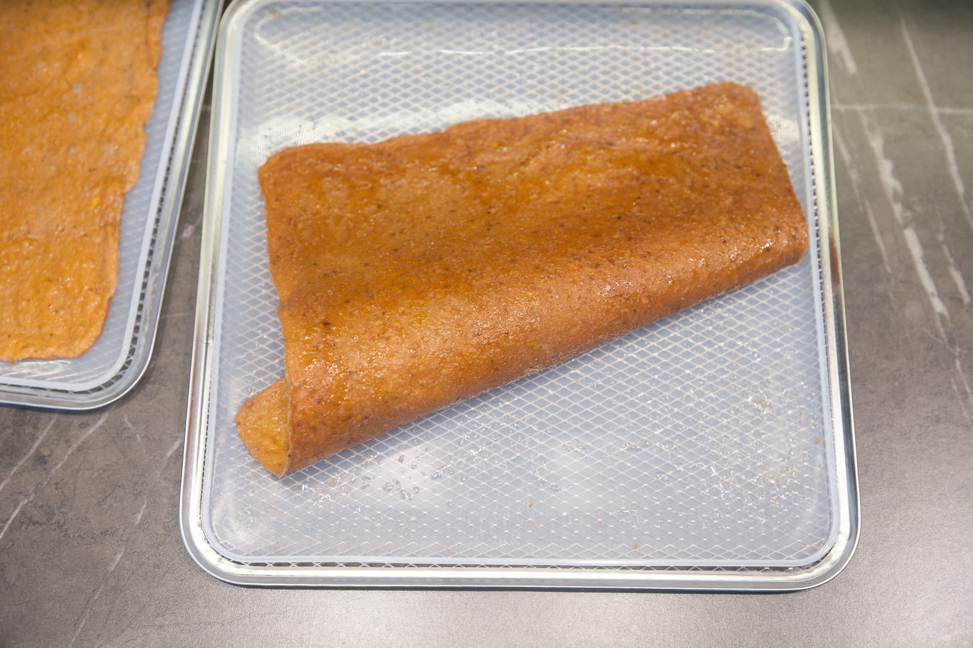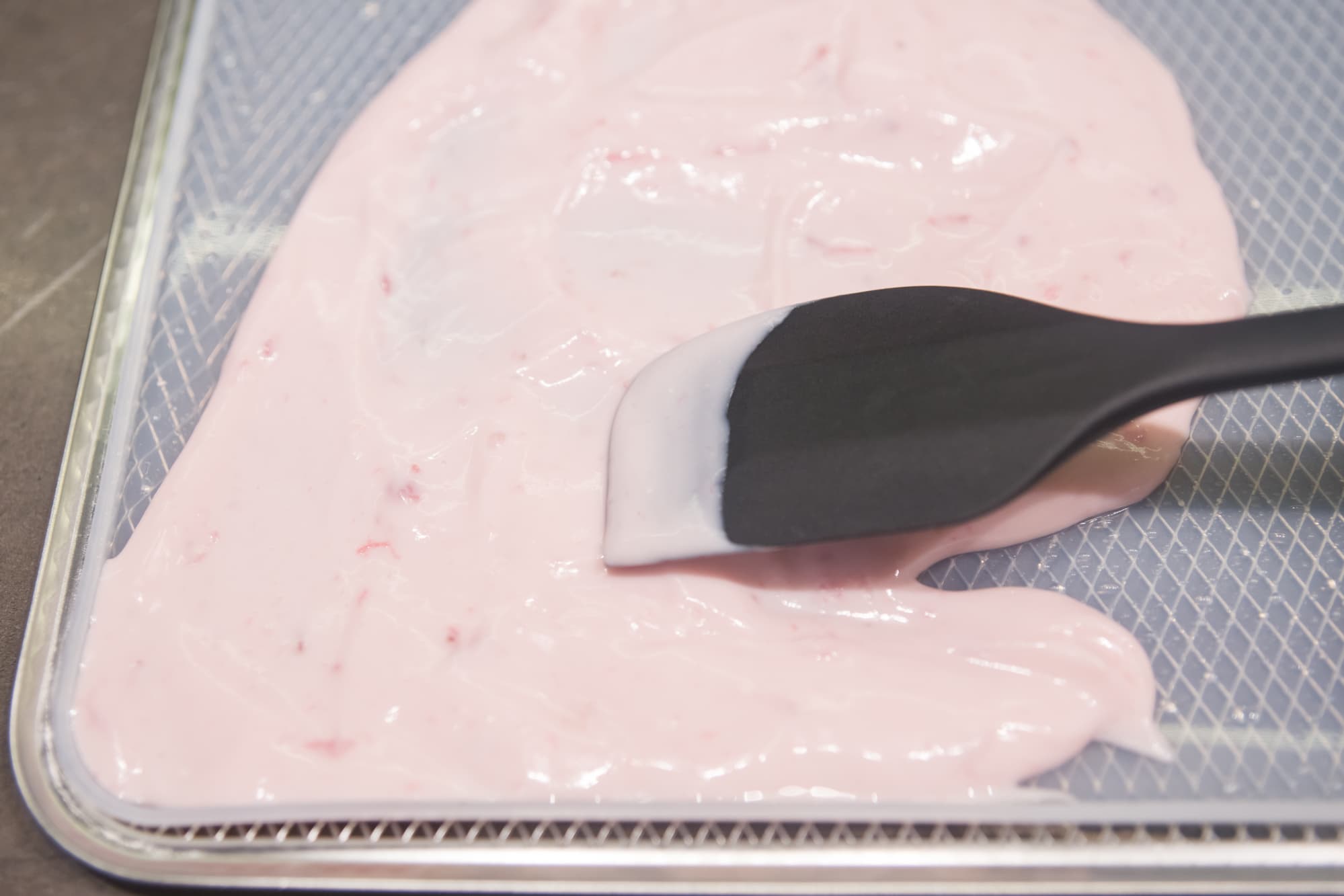 Десерт мы приготовили двух видов: из блендированных манго и бананов в пропорции 50/50 и из клубнично-земляничного густого йогурта жирностью 2,5%. Силиконовые поддоны смазали растительным маслом и равномерно распределили по нему подготовленные смеси. Дегидратор запустили на 12 часов при 60 °C.