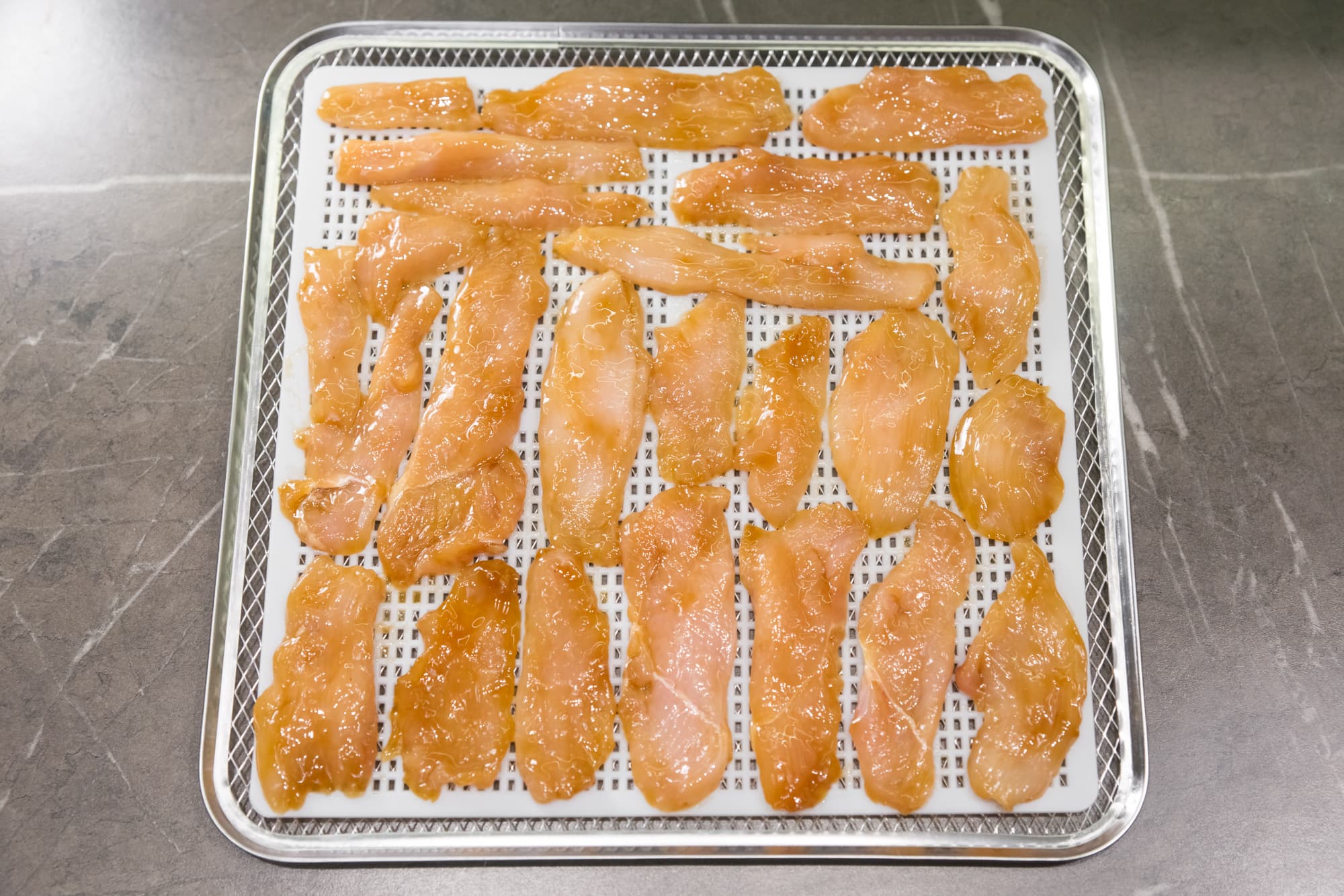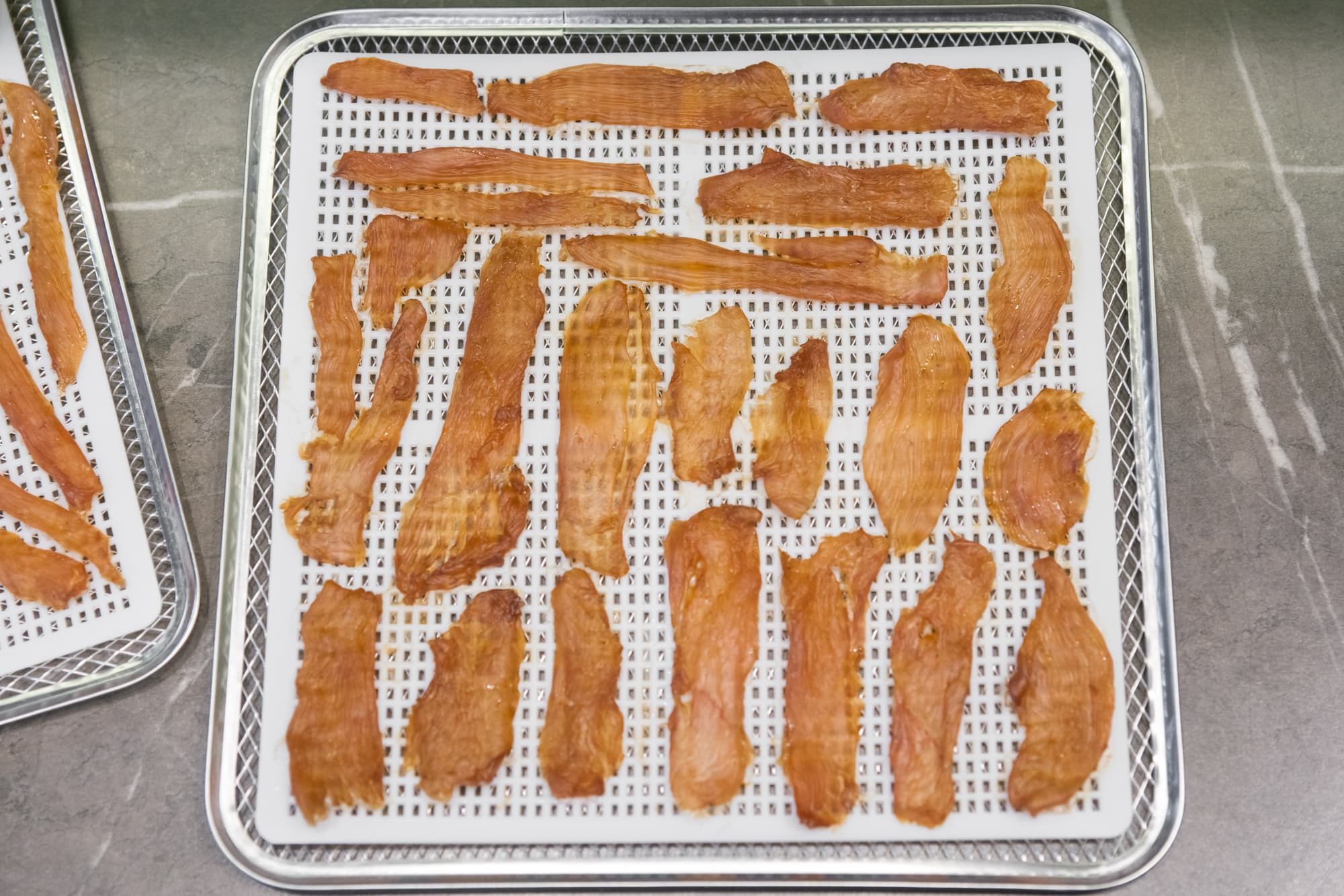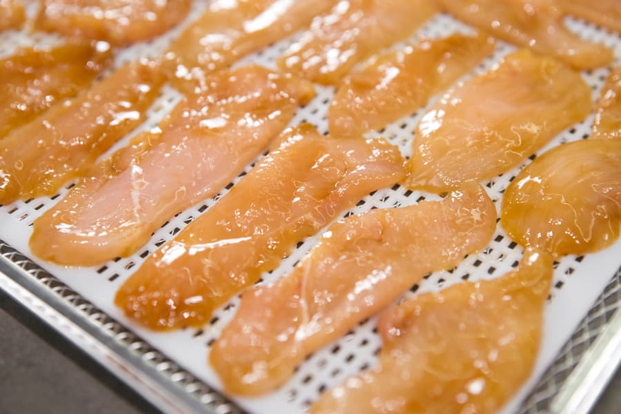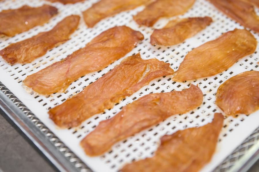 Установили температуру 65 °C и включили дегидратор на 6 часов. Первыми были готовы джерки. Те, что потоньше, вышли хрустящими, остальные, также отлично просушенные, остались немного гибкими.