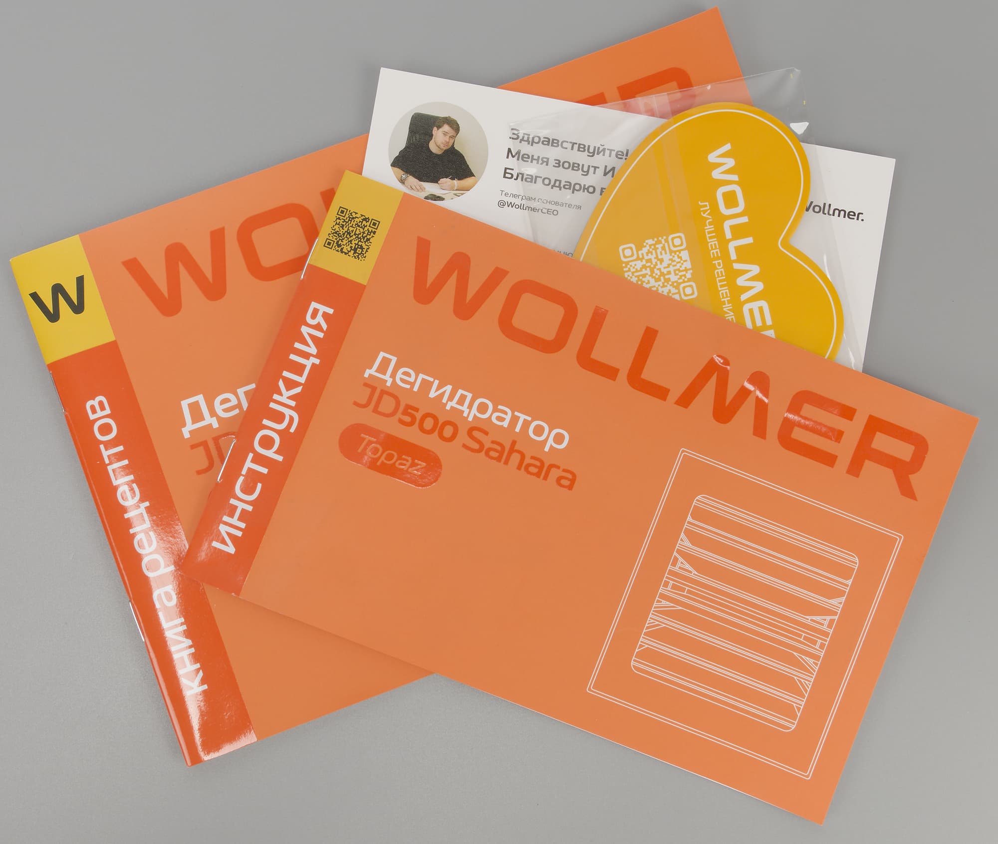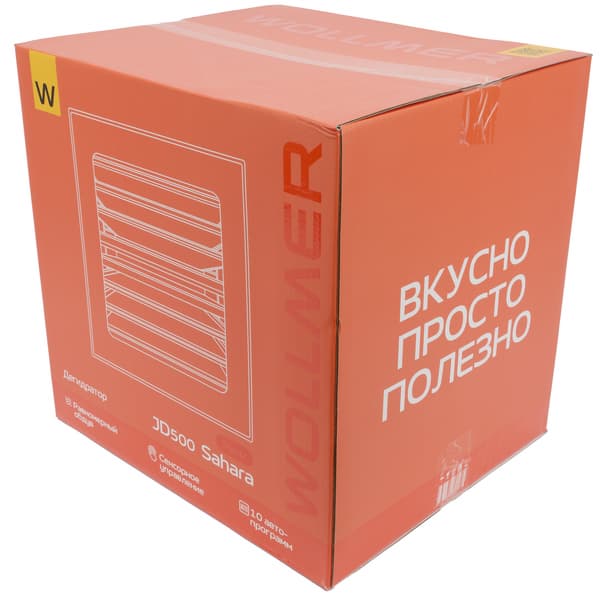 Дегидратор Wollmer JD500 Sahara прибыл к нам на тестирование сразу в двух коробках. Внешняя представляет собой стандартную транспортировочную упаковку из обычного коричневого картона. Внутри нее находится яркая оранжевая коробка, оформленная в фирменной стилистике бренда.