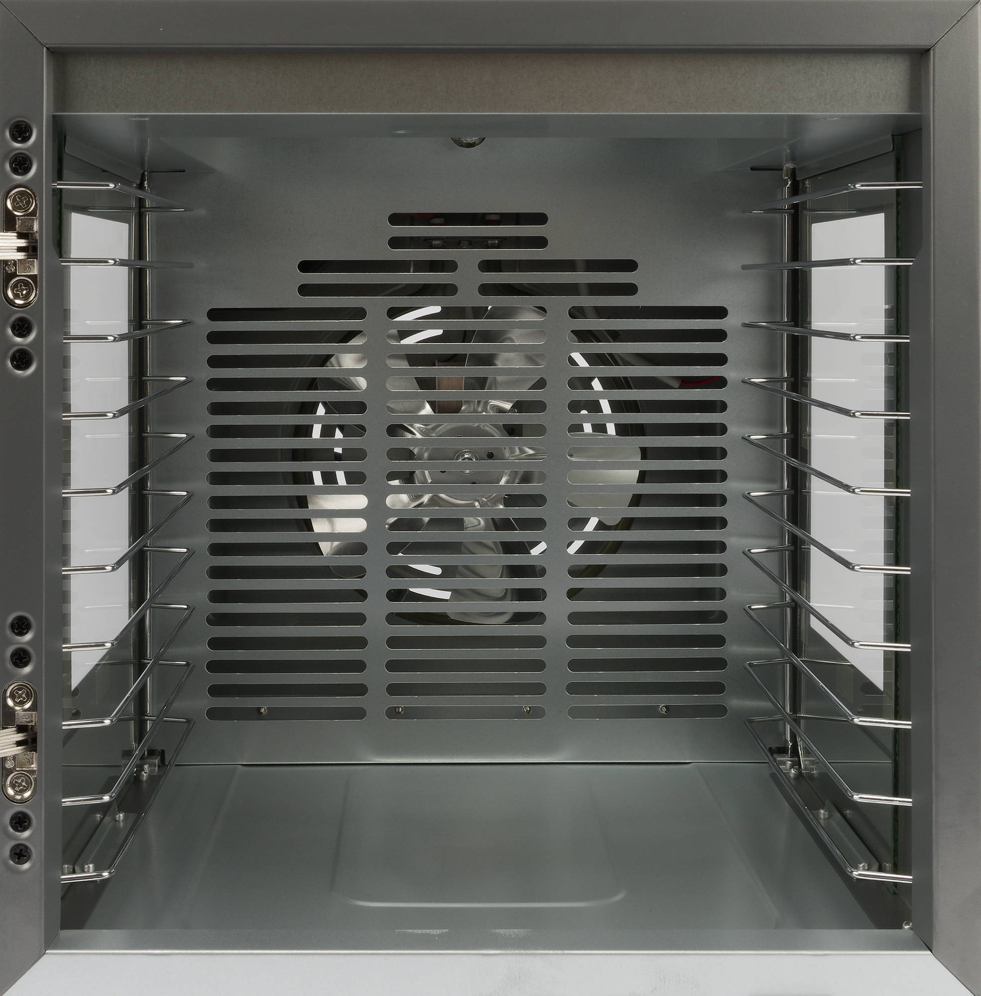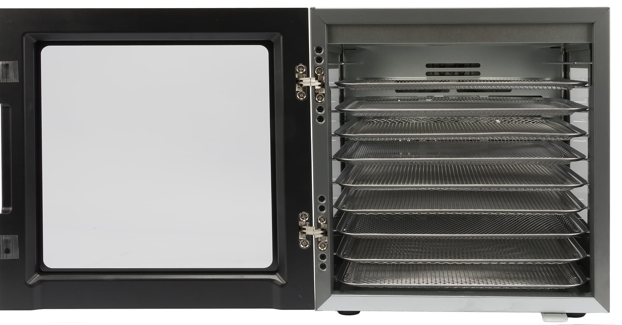 Стеклянная дверца с большим смотровым окошком обрамлена черной рамкой. Через прозрачное стекло хорошо просматриваются все уровни рабочей камеры. В закрытом состоянии дверца крепко фиксируется магнитами.