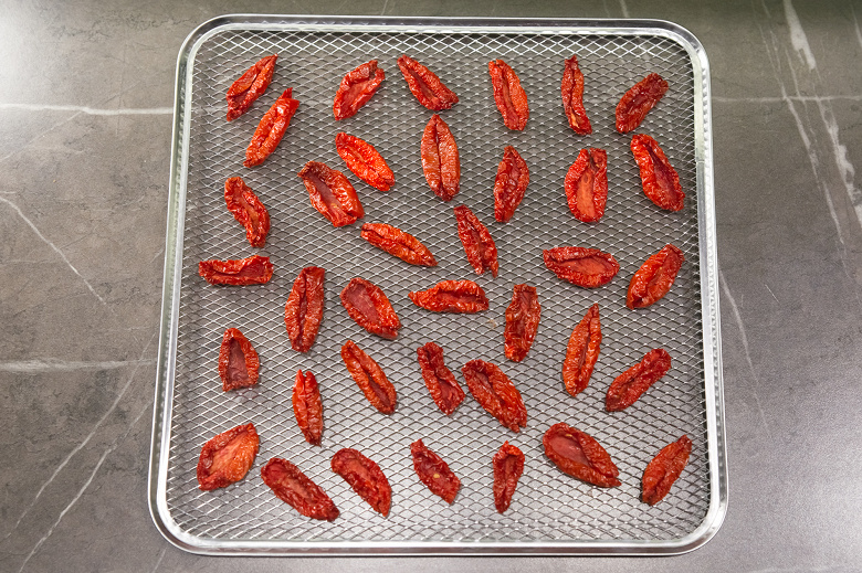 Помидорам понадобилось два дополнительных часа. Мы не стали сушить их до состояния чипсов, хотелось получить именно вяленые дольки.