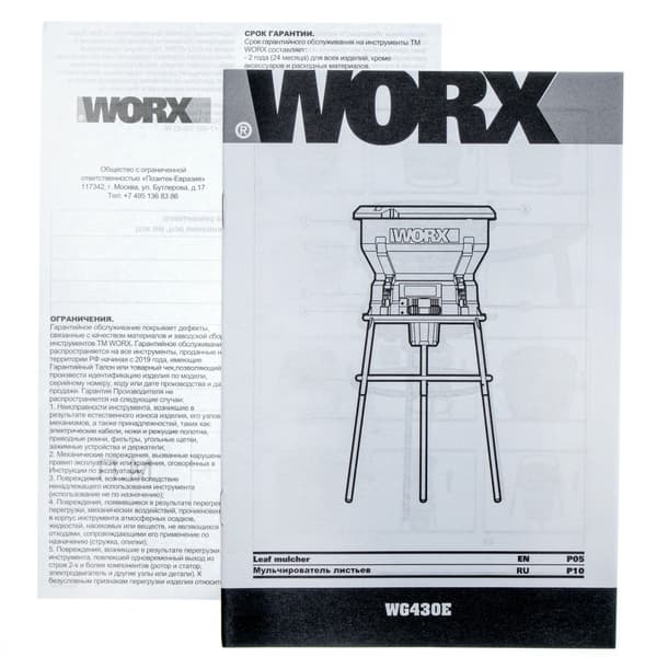 Руководство к мульчеру WG430E — книжка на 15 страницах формата А5. Она написана на английском и русском языке, снабжена пояснительными картинками и пиктограммами. Текст, вероятно, переводной, поэтому местами приходится догадываться, о чем идет речь. Пояснения по всем основным операциям — техническому обслуживанию, сборке и эксплуатации прибора — дополнены схемами и рисунками. Кроме этого в инструкции даны правила техники безопасности, технические данные и расшифровка значений пиктограмм на приборе.