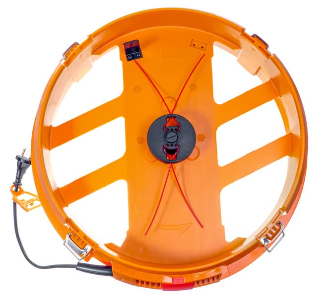 Моторный отсек представляет собой пластиковый цилиндрический корпус с большими прорезями для выпадения готовой мульчи, снизу которого закреплен мотор, а сверху — вращающаяся головка со вставленными в нее лесками для разрезания листьев.