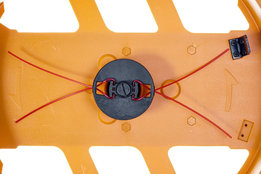 Лески вставляются в отверстия, сгибаются пополам и закрепляются продеванием в специальные петли вращающейся головки. Таким образом из двух лесок получаются четыре режущие поверхности. Для смены лесок не требуется ничего откручивать, все происходит предельно просто. Для выравнивания лесок по размеру внутри корпуса располагается нож, обрубающий лишнее при работе.