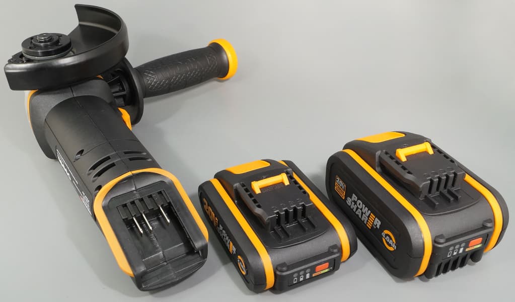 К рассматриваемой болгарке подходят 20-вольтовые аккумуляторы Worx серии PowerShare. Плюс в том, что на этих же аккумуляторах работает большинство инструментов данного бренда, от лобзиков и пил до шуруповертов и болгарок.