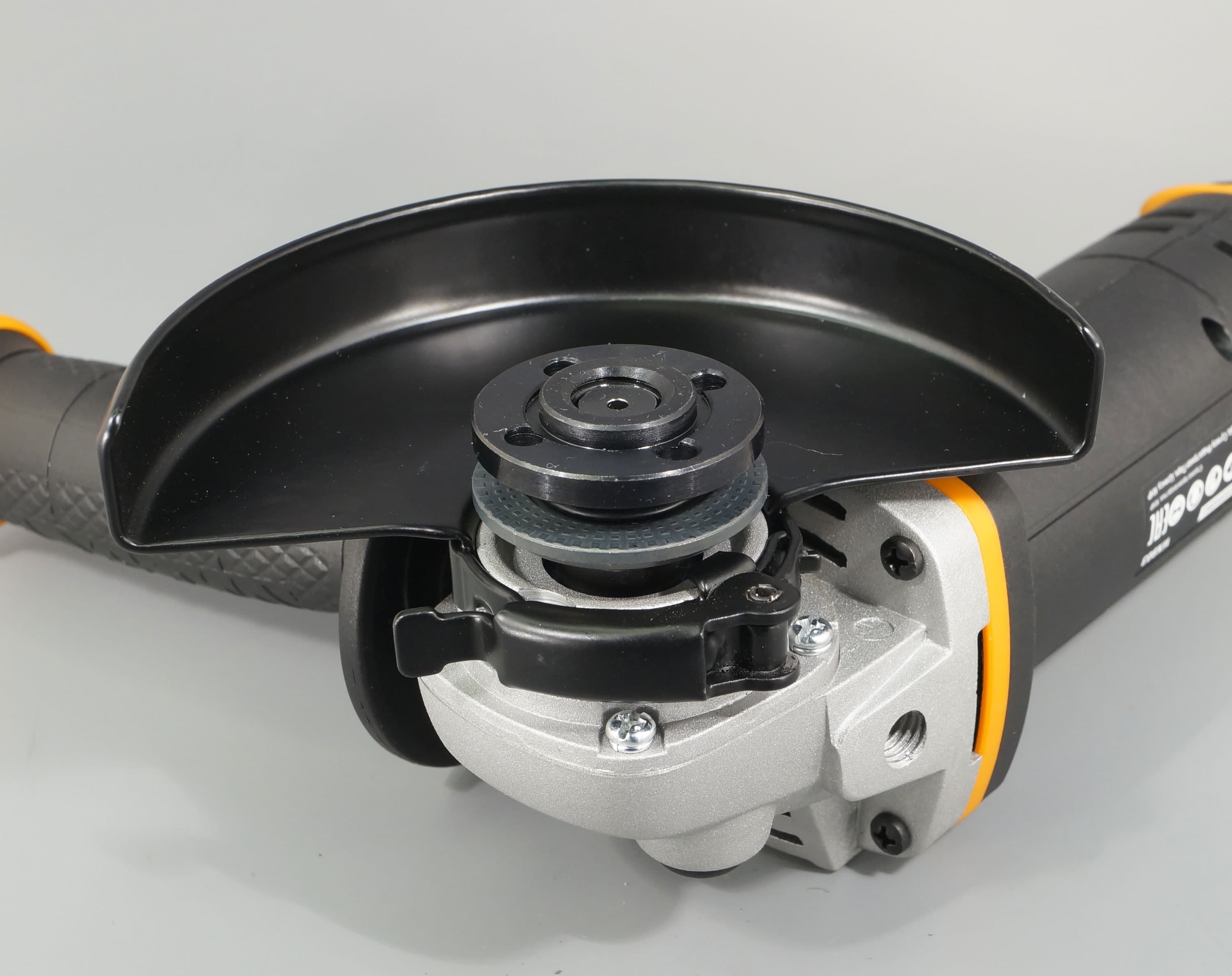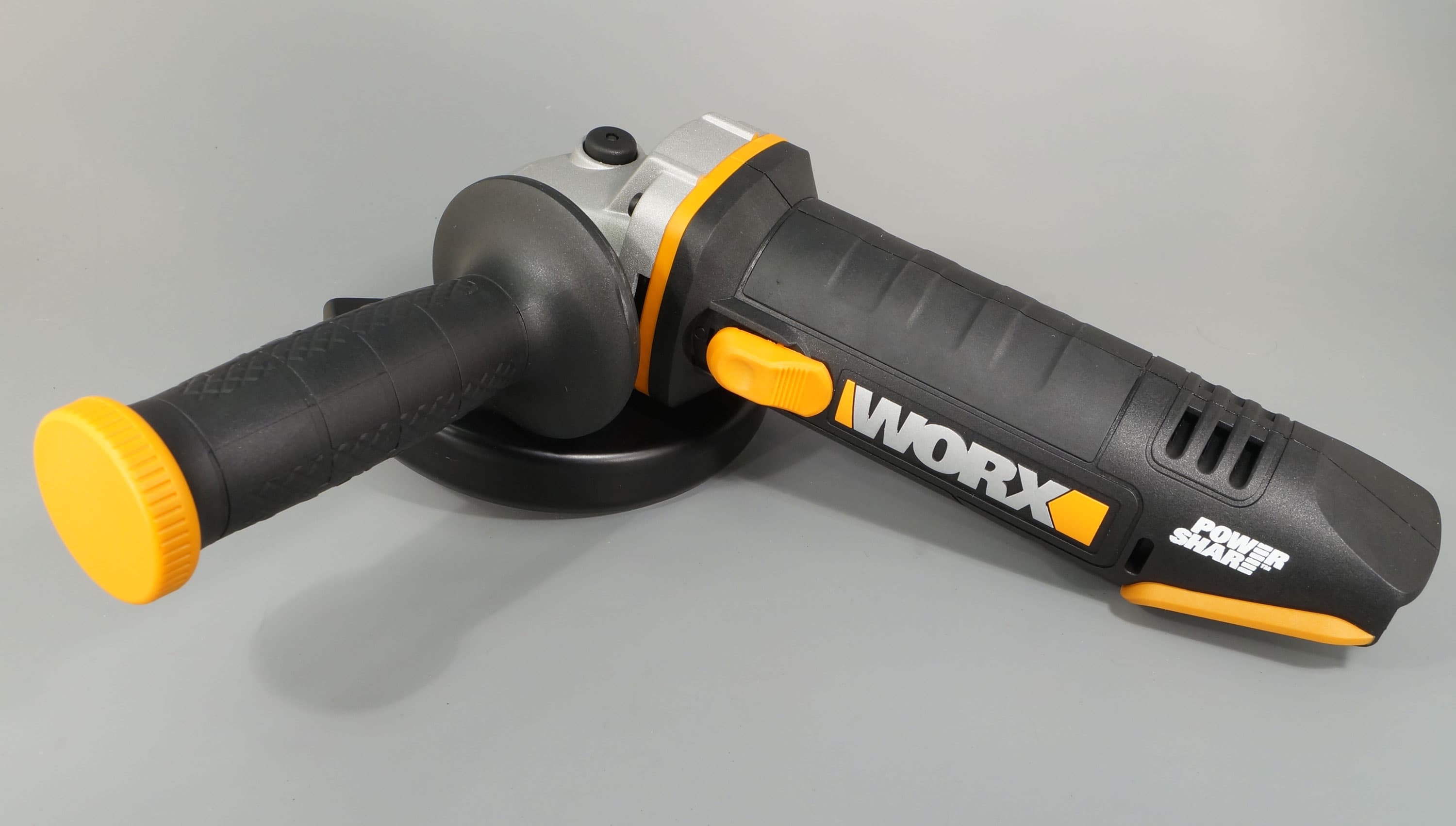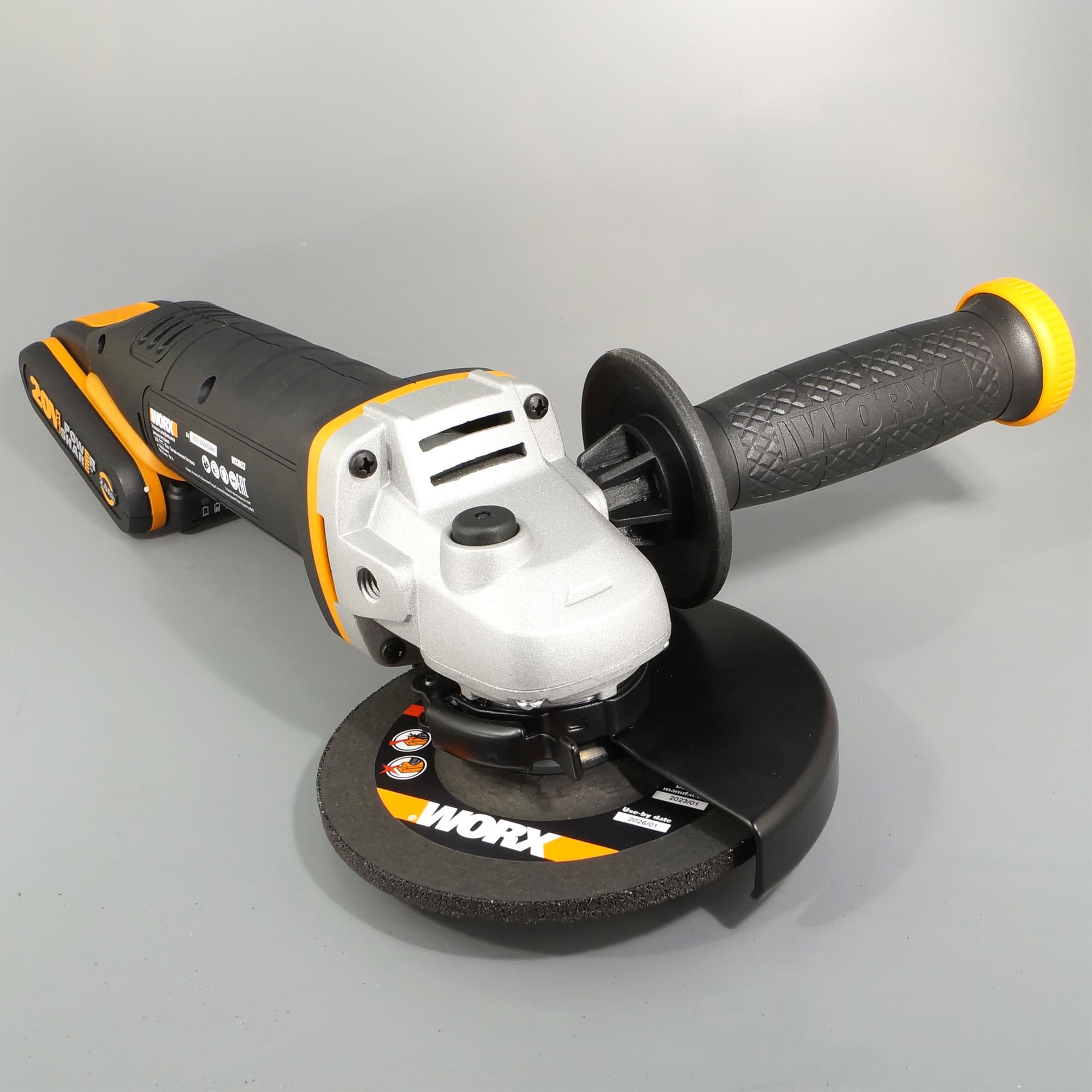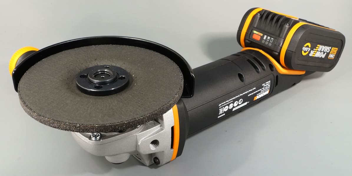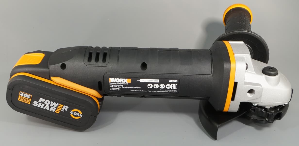 Поскольку болгарка не снабжается аккумуляторами, мы оказались свободны в выборе. Подойдет 20-вольтовая батарея Worx любой емкости, но для инструмента, который отличается повышенным энергопотреблением, разумнее будет использовать аккумулятор потолще, 4 А·ч.