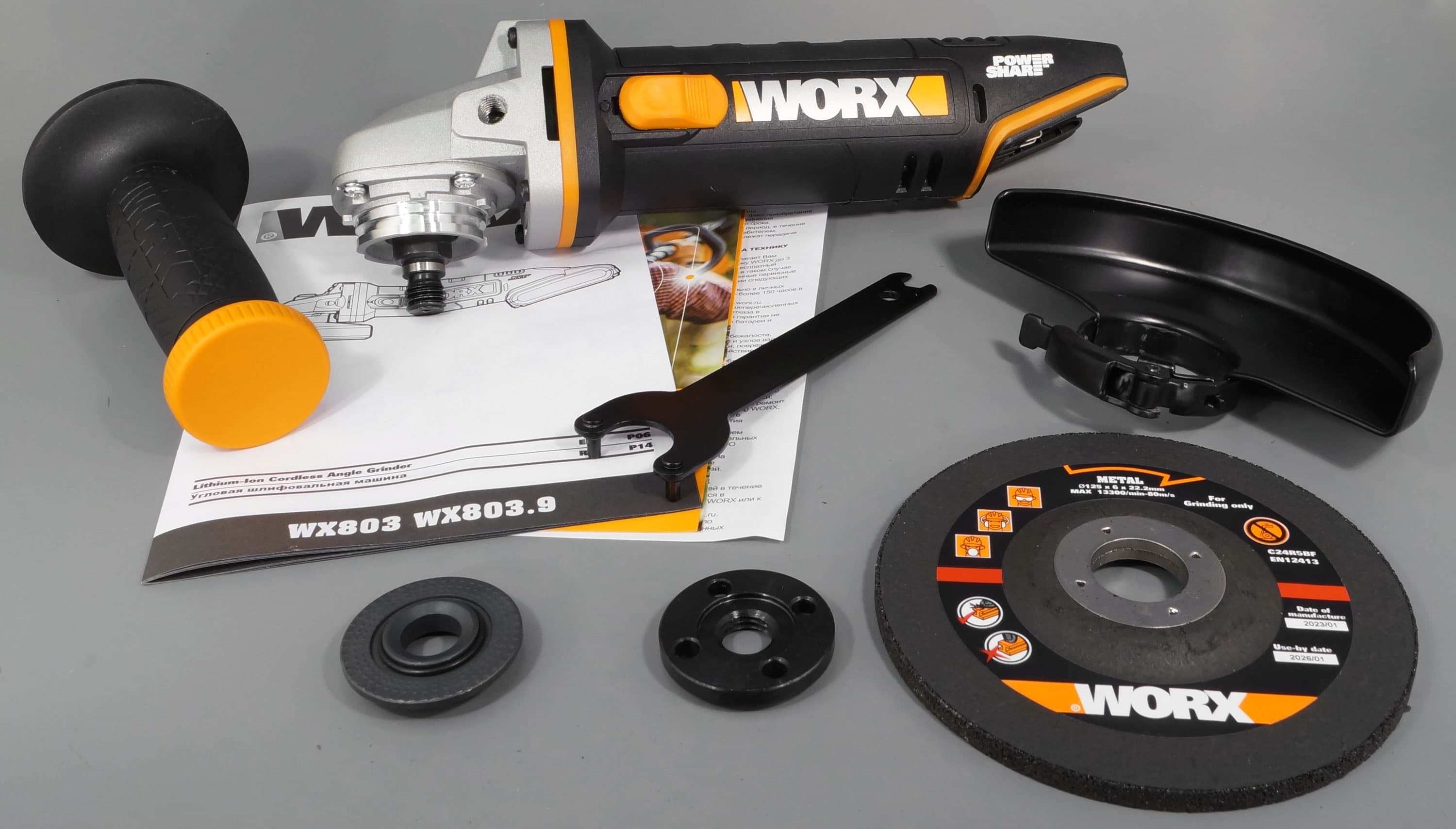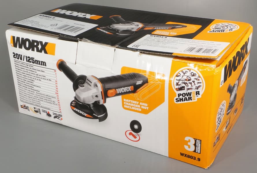В комплекте с УШМ имеется защитный кожух, рукоять, ключ и печатная продукция. Также в коробке оказался абразивный диск по металлу толщиной 6 мм. Батареи и зарядного устройства нет — комплект поставки WX803.9 явно предназначен для тех, кто уже владеет аккумуляторным инструментом Worx.