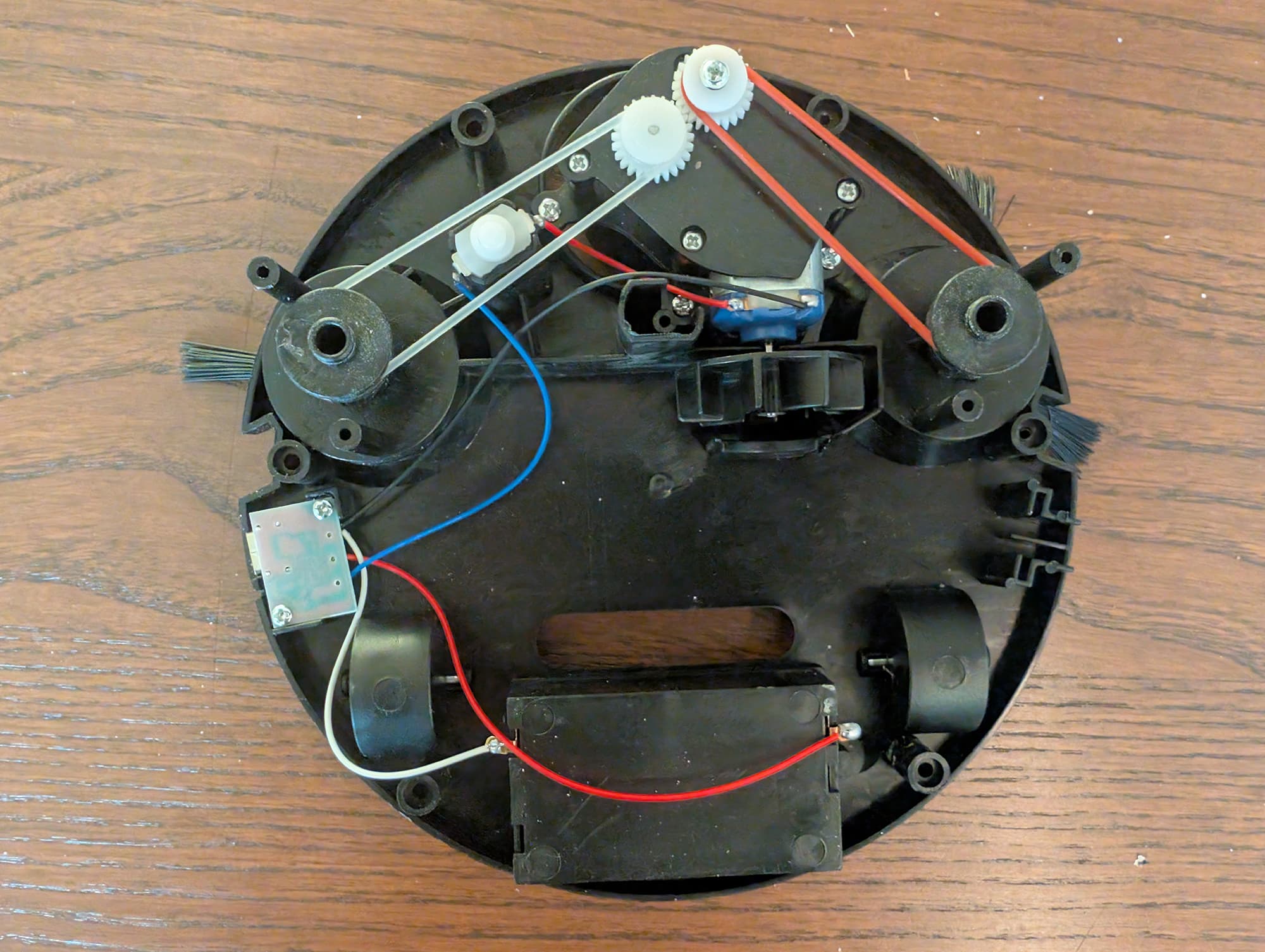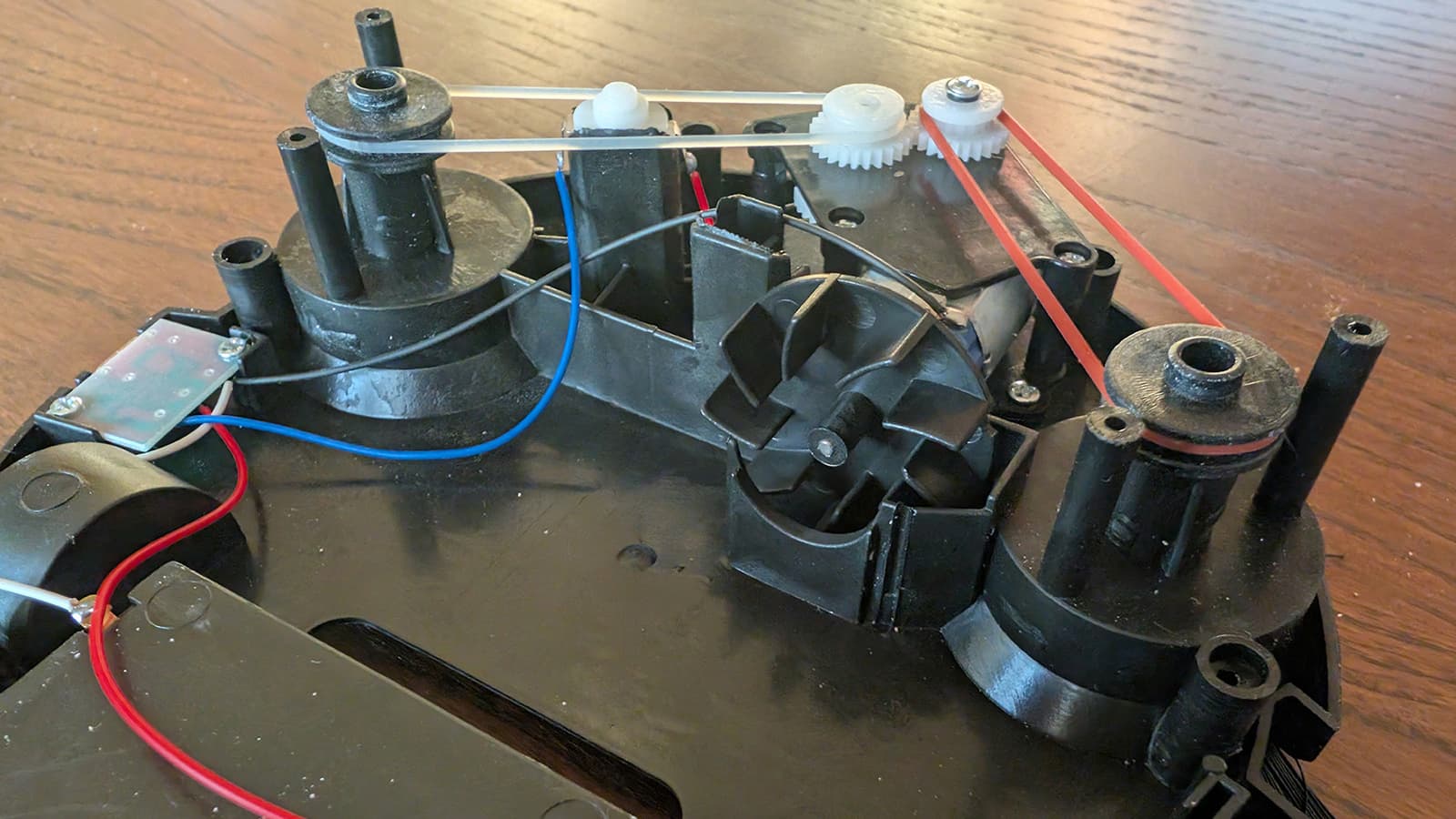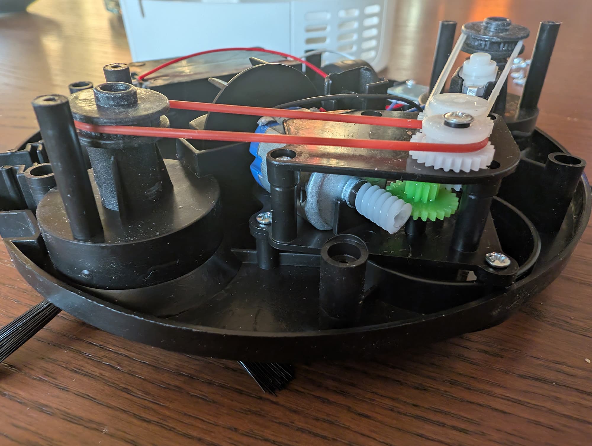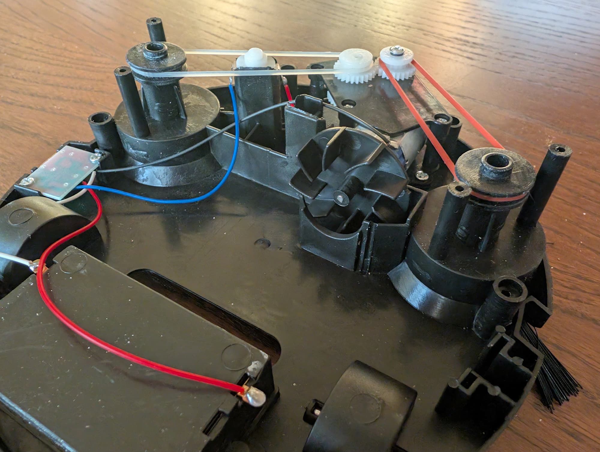 Вращение вала передается на ведущее колесо зубчатой передачей. Это самый сложный механизм в устройстве — в нем целых две шестерни и червяк. Боковые щетки приводятся в действие с помощью разноцветных резиновых пассиков.