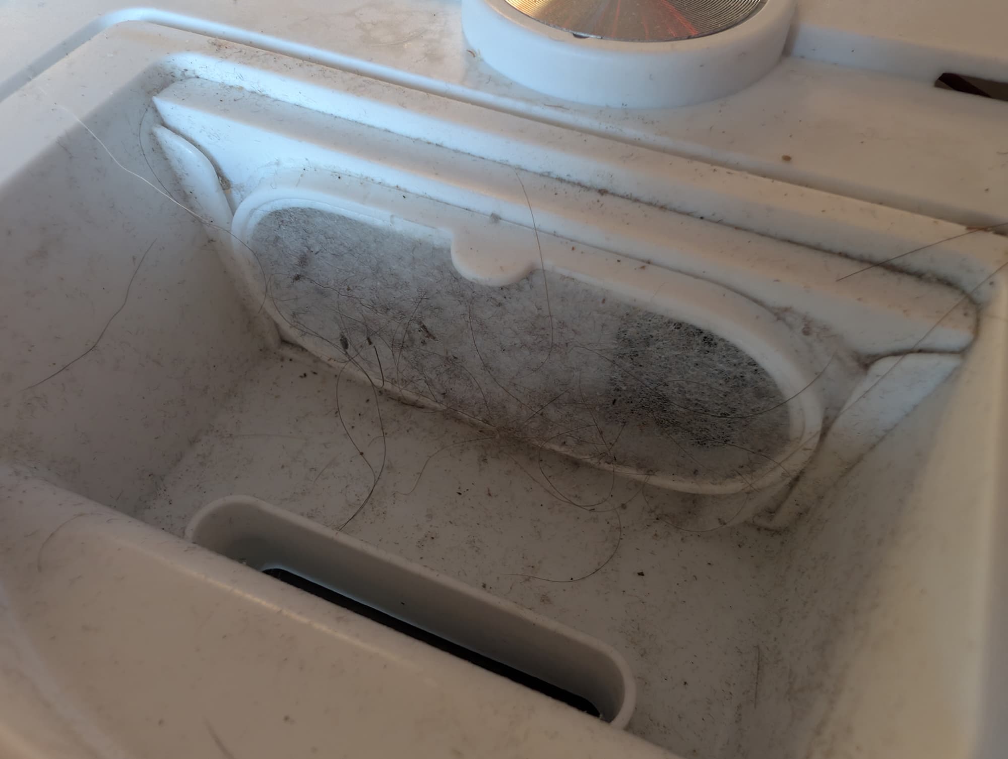 Двигаясь своим незамысловатым маршрутом, он пытается всосать мусор, но мощности всасывания хватает только на мелкую пыль, ворсинки и недлинные волоски. Вот так выглядит пылесборник после 15-минутной прогулки по среднезагрязненному полу: