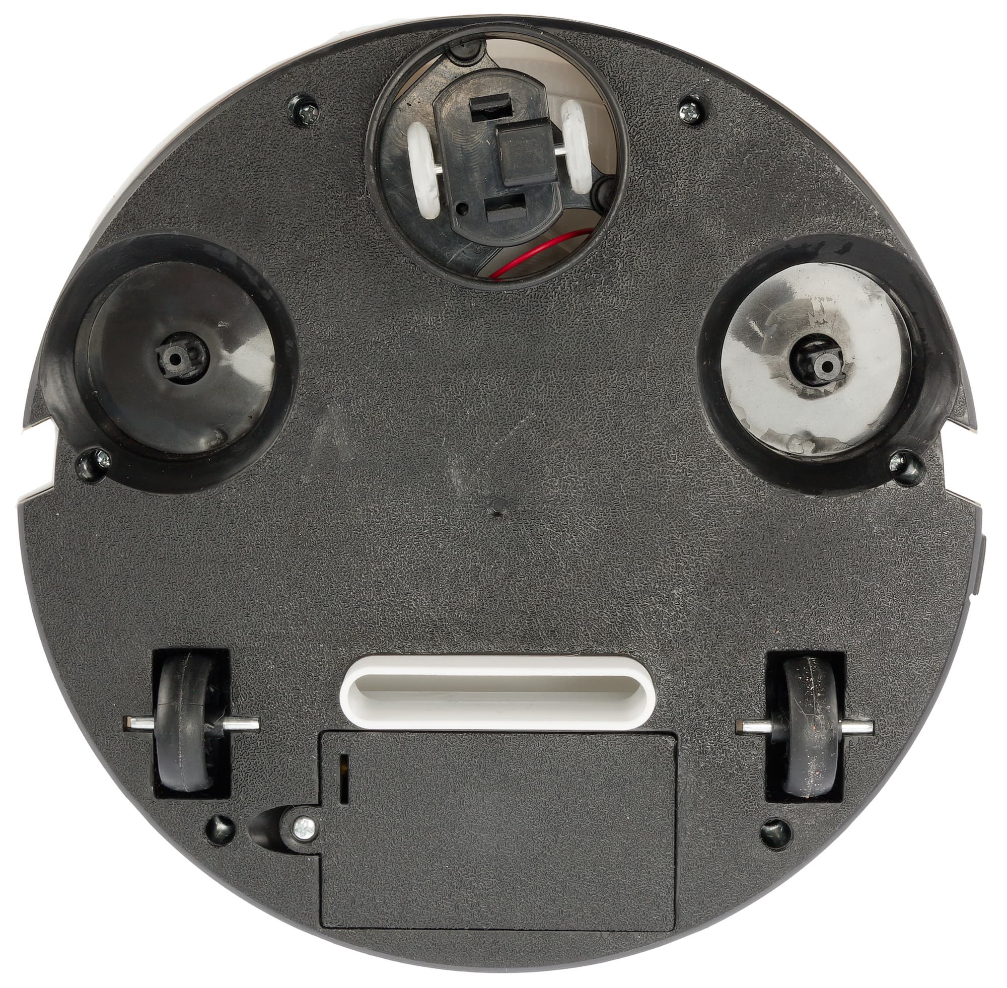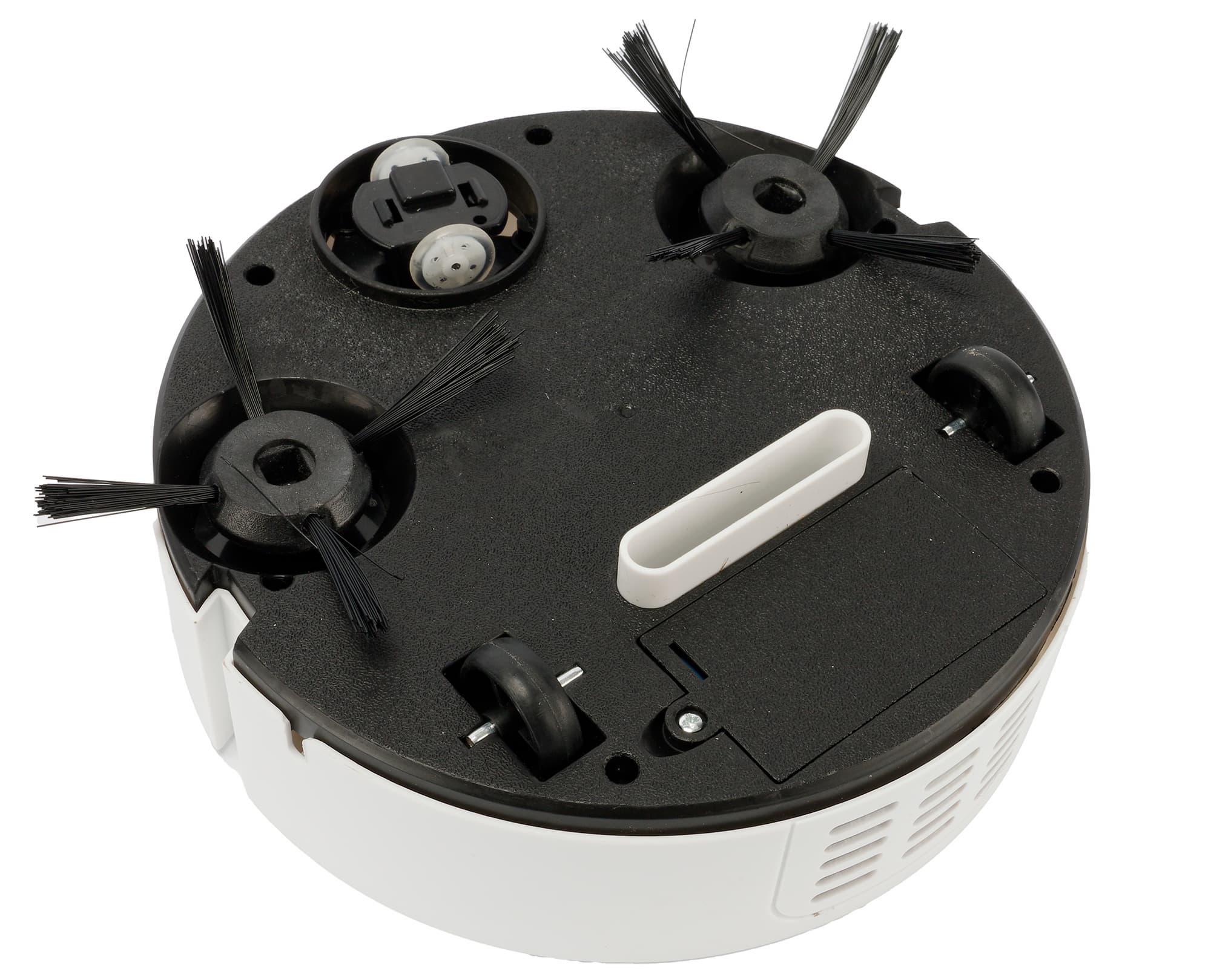Ходовая часть XFX015 принципиально отличается от традиционной для настоящих роботов-пылесосов. Боковые колеса свободно вращаются, а в движение изделие приводится двумя роликами в передней части. Круглая платформа, на которой они установлены, при столкновении с препятствием поворачивается на случайный угол: это несложное механическое устройство и обеспечивает изменение направления движения. Обещанных продавцом «интеллектуальных датчиков» мы не обнаружили.