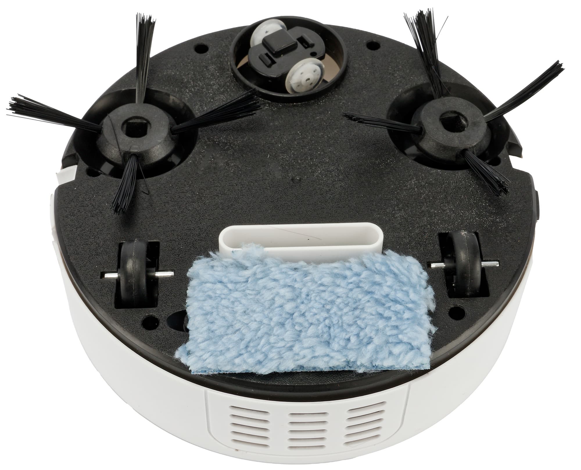 За влажную уборку у этой модели отвечает трогательный клочок голубого искусственного меха, который следует приклеить на крышку батарейного отсека с помощью двустороннего скотча. Увлажнять его, по задумке конструктора, предстоит вручную.