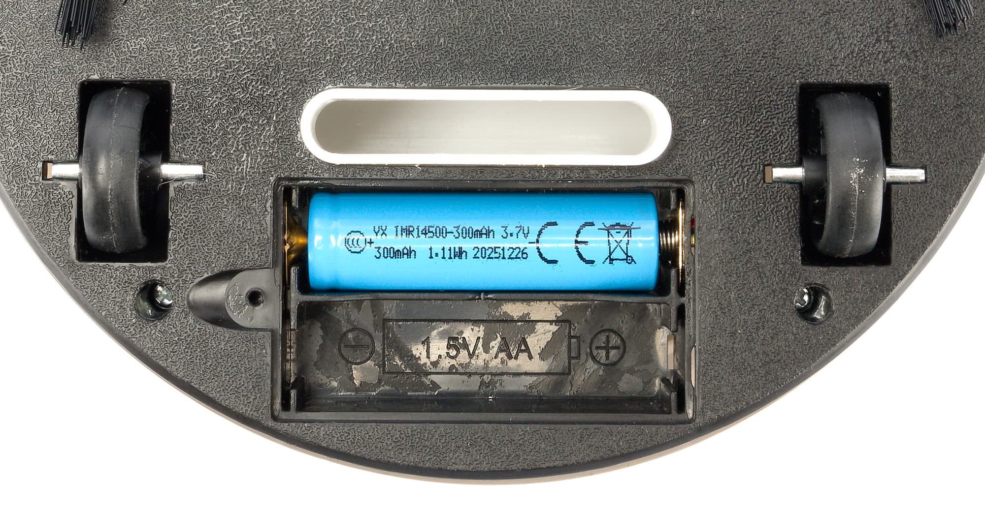 Ближе к корме устройства, за щелью для сбора мусора, располагается батарейный отсек.