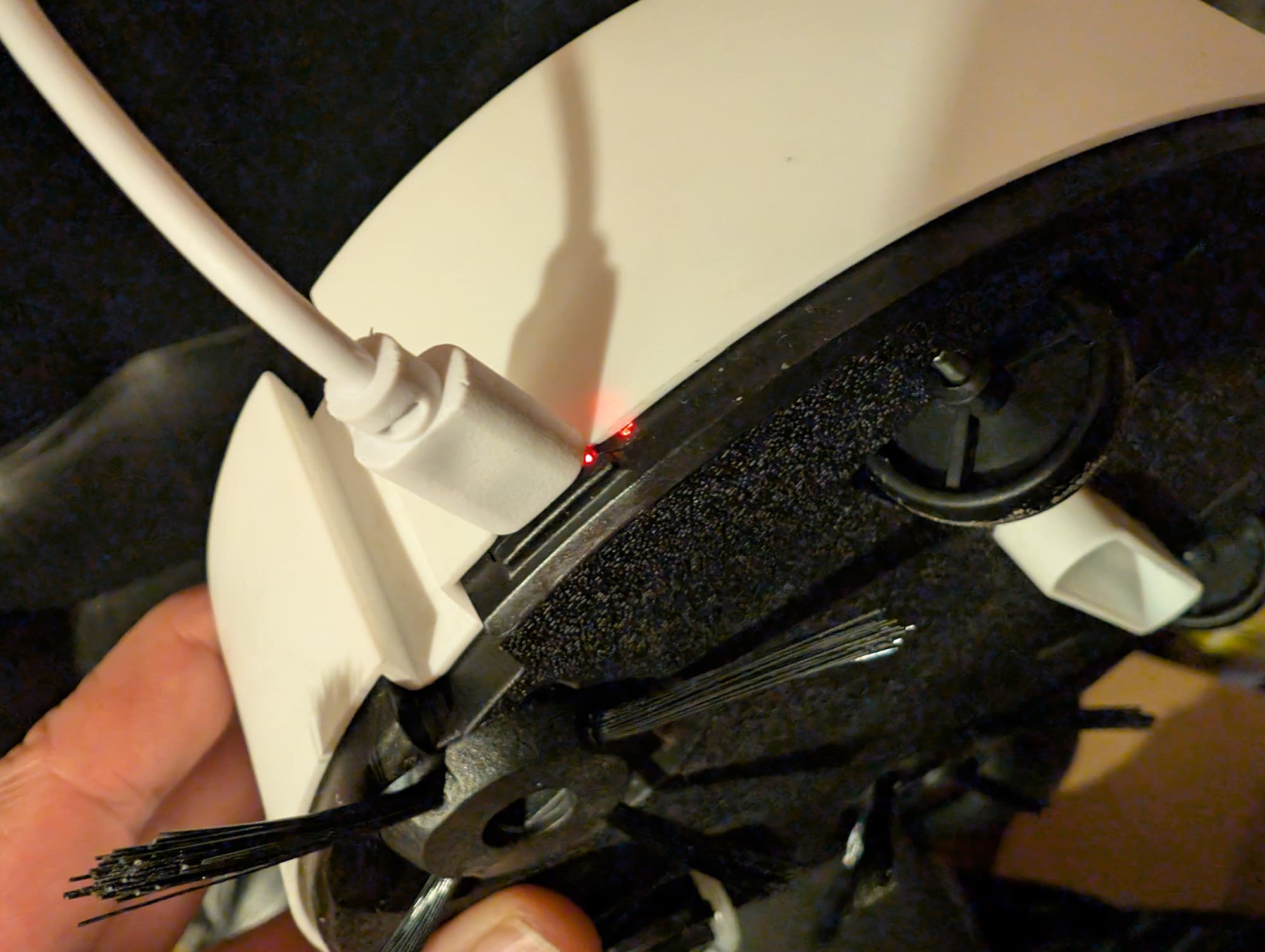 На боку прибора размещен разъем для зарядки. Штекер Type-C подключается к нему вручную: базовой станцией пылесос не оборудован.