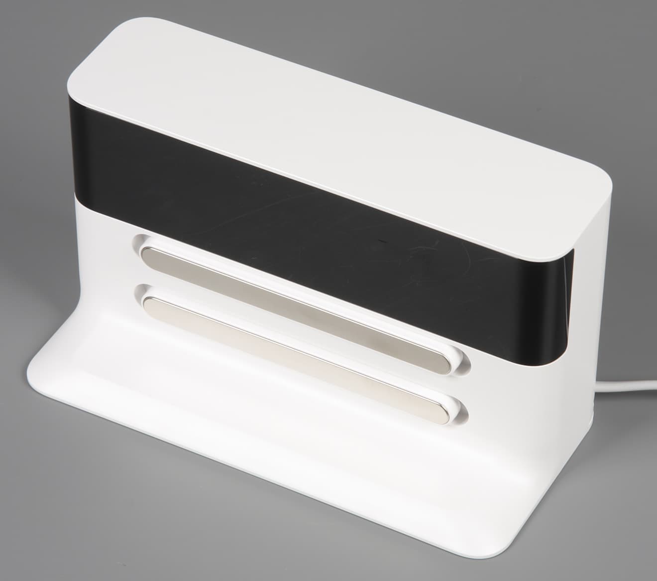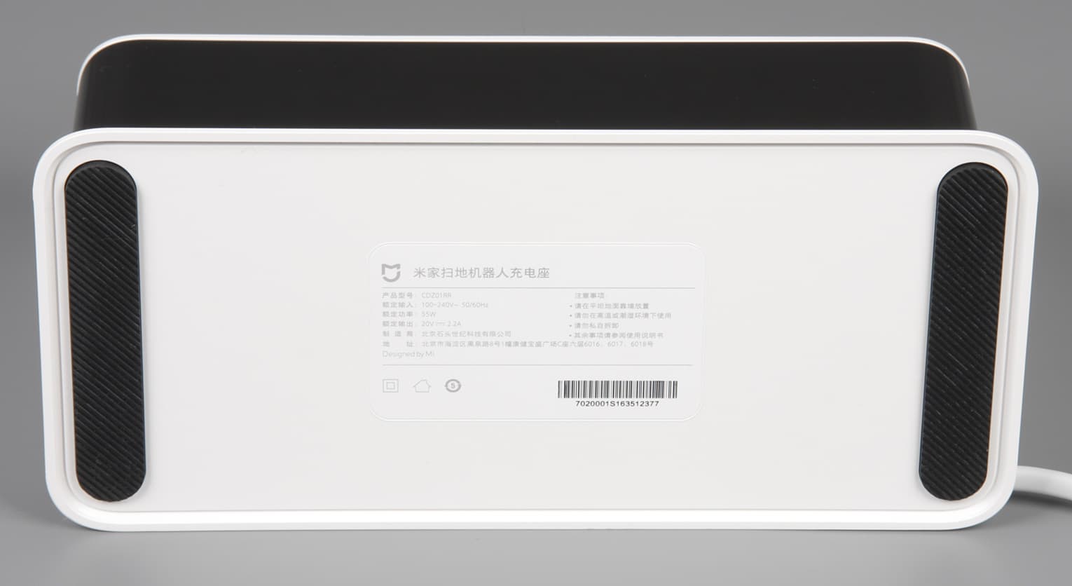 Площадь днища увеличена за счет поддерживающей выступающей вперед юбки. В итоге база стоит довольно устойчиво и может быть установлена на полу без какой-либо дополнительной поддержки. На передней панели базы — большое окошко из тонированного полупрозрачного пластика, за которым находятся пассивные маячки парковки (чередующиеся полоски из поглощающего и отражающего материала). Ниже — длинные подпружиненные контактные площадки.