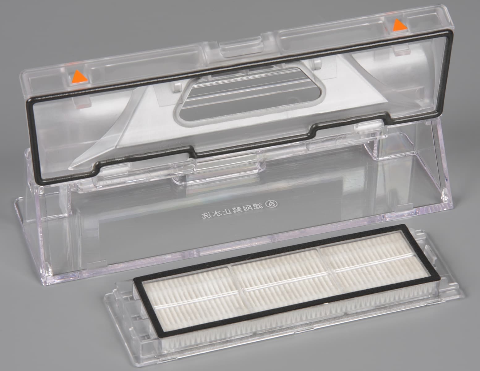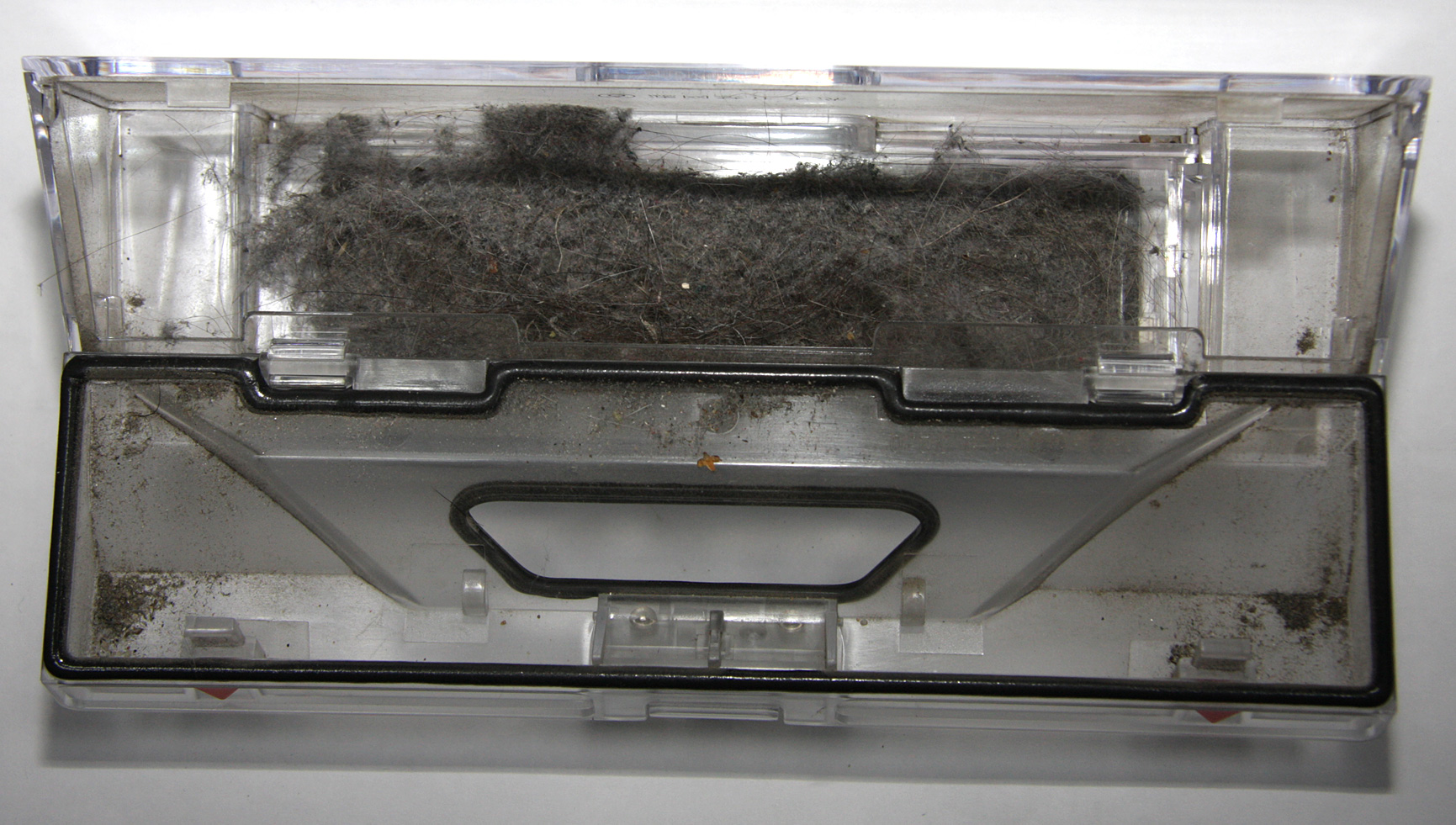 Робот отслеживает наличие пылесборника в своем отсеке, вернее фильтра на нем, для чего на рамке фильтра закреплен небольшой магнитик, а в отсеке имеется соответствующий датчик. Складчатый мелкопористый фильтр защищает крупноячеистая сеточка из пластика, задерживающая крупный мусор. Без этой сеточки складки подобных фильтров забиваются мусором, который трудно оттуда вычищать.