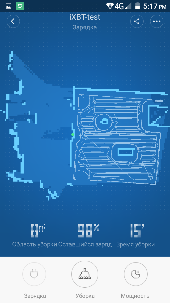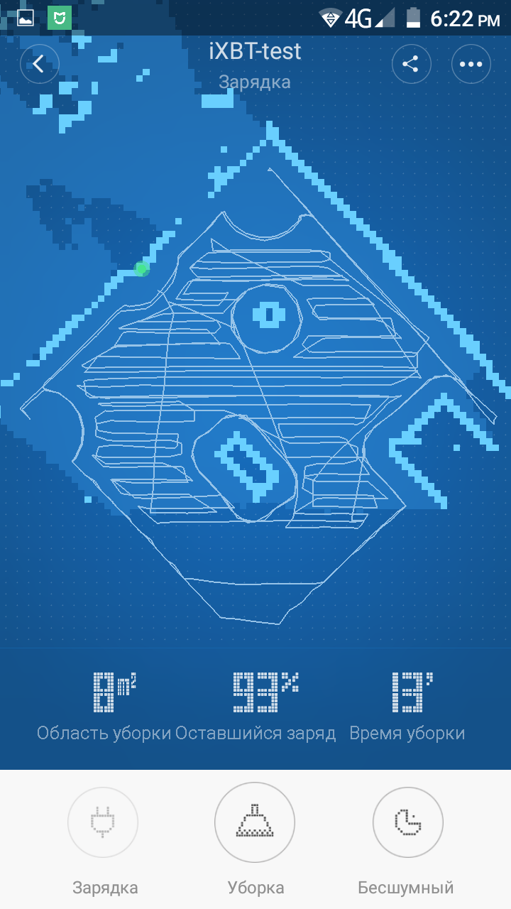 Убирал робот 93 минуты. В случае такого большого помещения робот разбивает его на участки размером примерно 3,5 на 3,5 м, повторяя в каждом один и тот же цикл — обход участка по периметру, затем змейкой обход внутренней площади участка и переход к следующему участку. Как и все побывавшие у нас на тестировании роботы с навигацией Xiaomi Mi Robot Vacuum не оперирует такими понятиями как комната и стены, с его точки зрения есть какая-то доступная площадь и препятствия на ней, как робот обойдет эту площадь определяется порядком обнаружения препятствий и алгоритмом уборки, на реальные комнаты робот площадь не делит. По данным из приложения, убранная площадь составила 84 м², но напомним, что из указанных нами 110 м² нужно вычесть значительную площадь, занимаемую мебелью и оборудованием. По данным из приложения, работ закончил с уборкой с зарядом на уровне 38%, но из-за проблем с обновлением информации эти данные могут быть недостоверными. Так в дополнительных тестах на той же мощности вентилятора робот от полного заряда до уровня в 19% (напомним, что при уровне ниже 20% робот перестает убирать и возвращается на базу) проработал 103 минуты. То есть на одном заряде в режиме максимальной мощности робот убирает на площади примерно в 120 м². С учетом одной подзарядки (а в явном виде нигде не сказано, сколько раз робот может подзаряжаться и самостоятельно возобновлять уборку) в этом режиме робот может убрать до 240 м². В режиме с пониженной мощностью вентилятора максимальная площадь, соответственно, увеличивается.