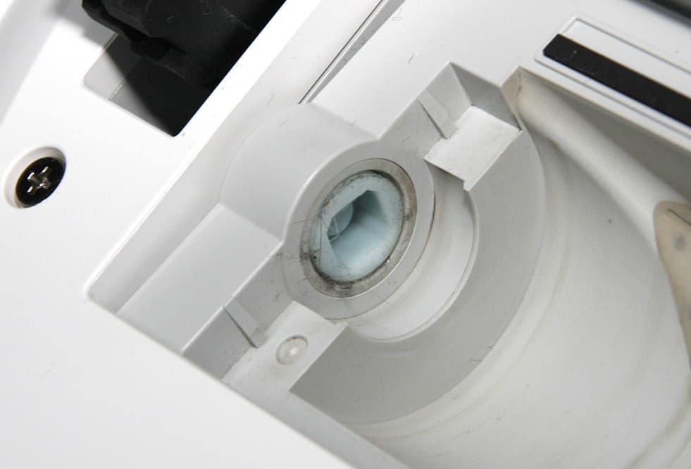 Корпус пылесборника изготовлен из прозрачного пластика. Однако крышка верхней панели непрозрачная, поэтому, не приподняв ее, невозможно оценить фактическое заполнение пылесборника. Датчика переполнения пылесборника, видимо, нет, объем пылесборника относительно небольшой, поэтому пользователю придется часто заглядывать под крышку. Спереди у пылесборника есть крышка, которую нужно откинуть при очистке этой емкости. Задний торец пылесборника заглушен воздушным фильтром. Для исключения паразитного подсоса воздуха стыки патрубка и пылесборника, а также фильтра и всасывающей решетки оснащены упругими уплотнителями. Судя по перечеркнутой капельке, пылесборник запрещено мыть.