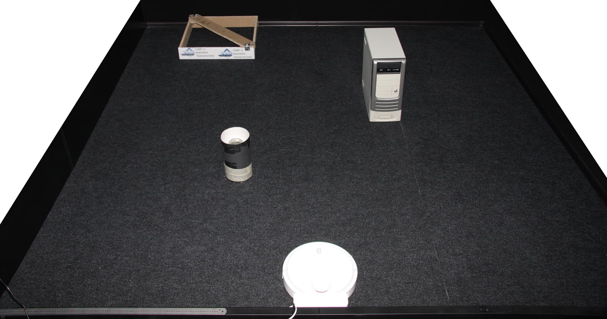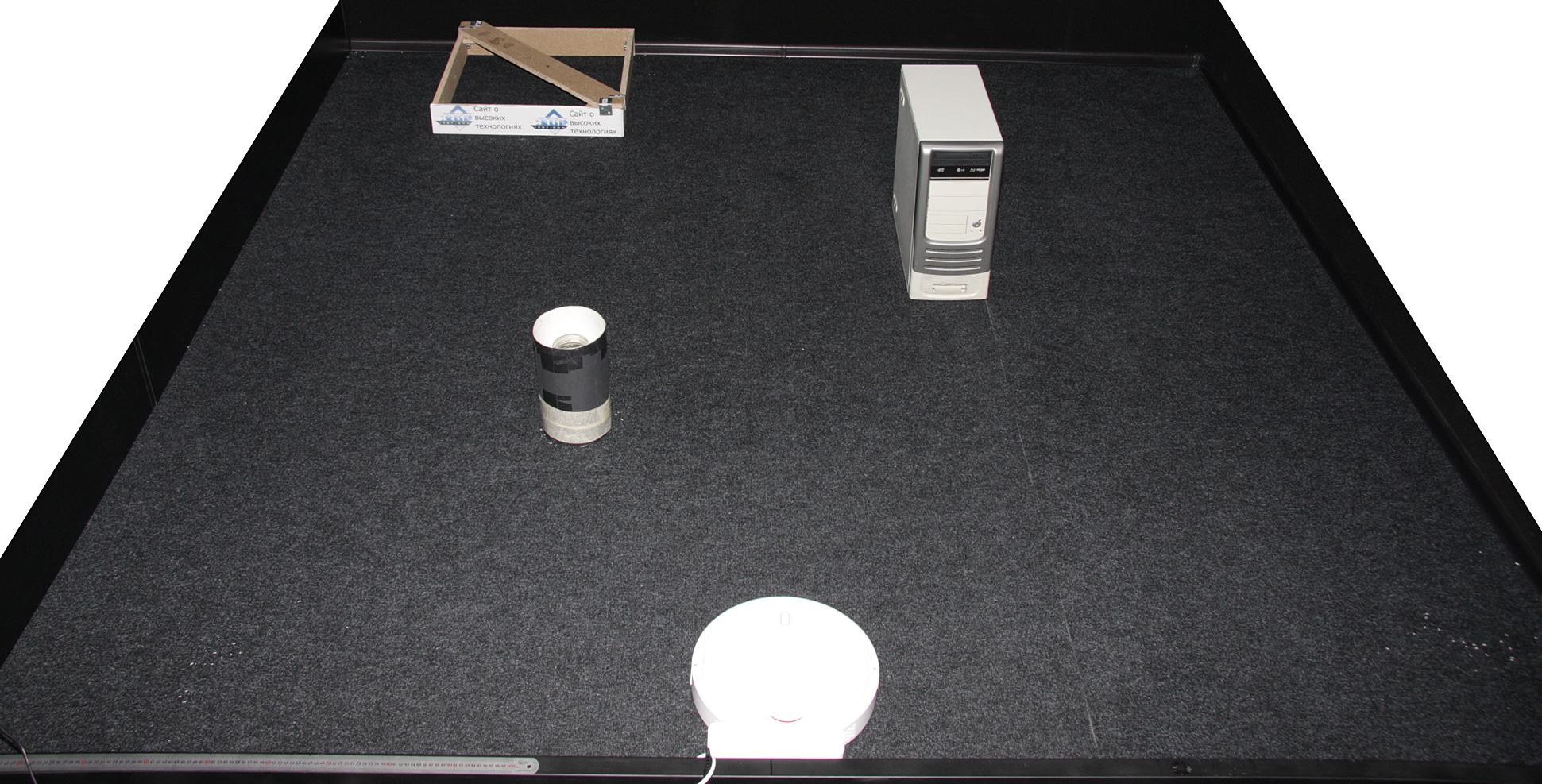 В первом в тесте локальной уборки из-за черных и почти не отражающих стен робот потерял ориентацию. Две коробки помогли ему сохранять привязку к местности, и уборка успешно завершилась. Процесс показан на видео ниже: