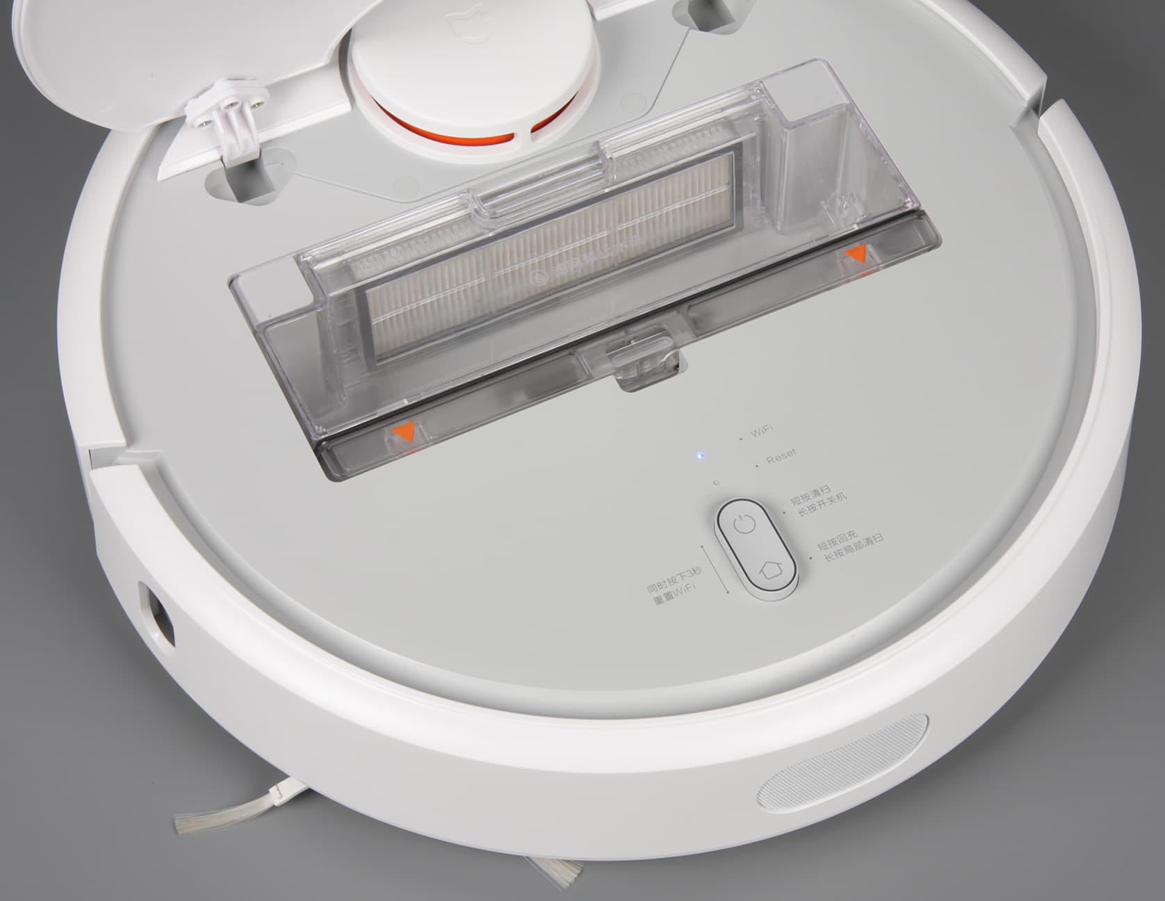 О своем состоянии пылесос информирует с помощью светодиодного индикатора — ободка вокруг кнопки-качалки, — а также проговаривая слова, фразы и даже длинные предложения на чистом китайском языке. При желании это голосовое оповещение можно отключить, но только вместе с возможностью запуска на уборку.
