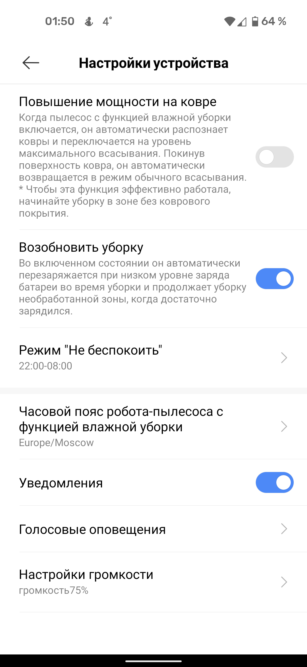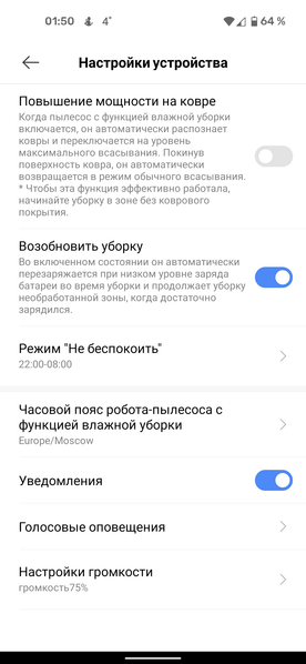 В разделе настроек можно включить также функцию повышения мощности на ковре, разрешить возобновлять уборку после вынужденного перерыва, настроить ночной режим, выбрать часовой пояс, отключить уведомления, выбрать языковой пакет (доступны китайский и английский языки) для голосовых сообщений и нужный уровень их громкости.