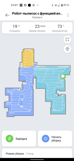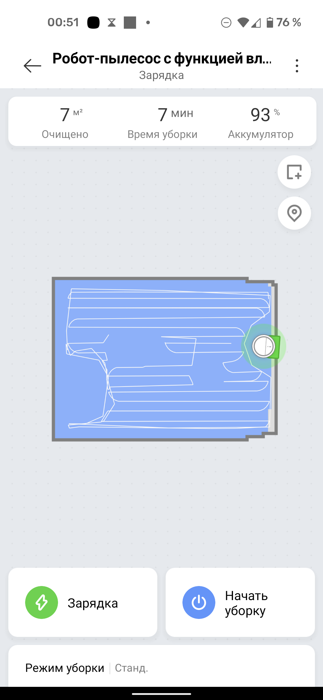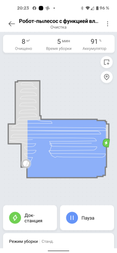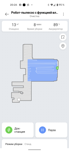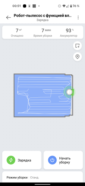 Маршрут движения прибора можно видеть на карте из приложения. Точная продолжительность уборки от запуска до сигнала об окончании составила 7 минут 55 секунд. За это время пылесос убрал 90,5% мусора.