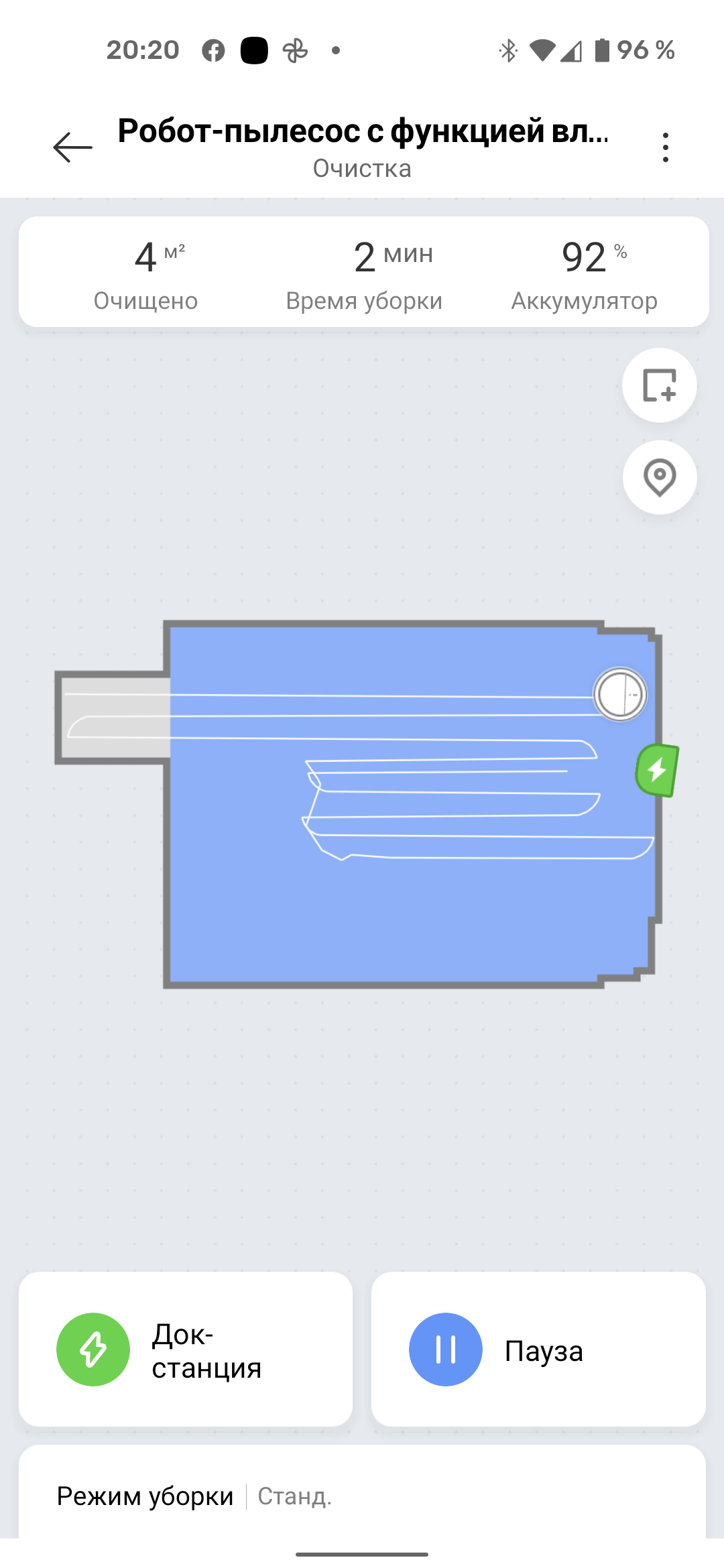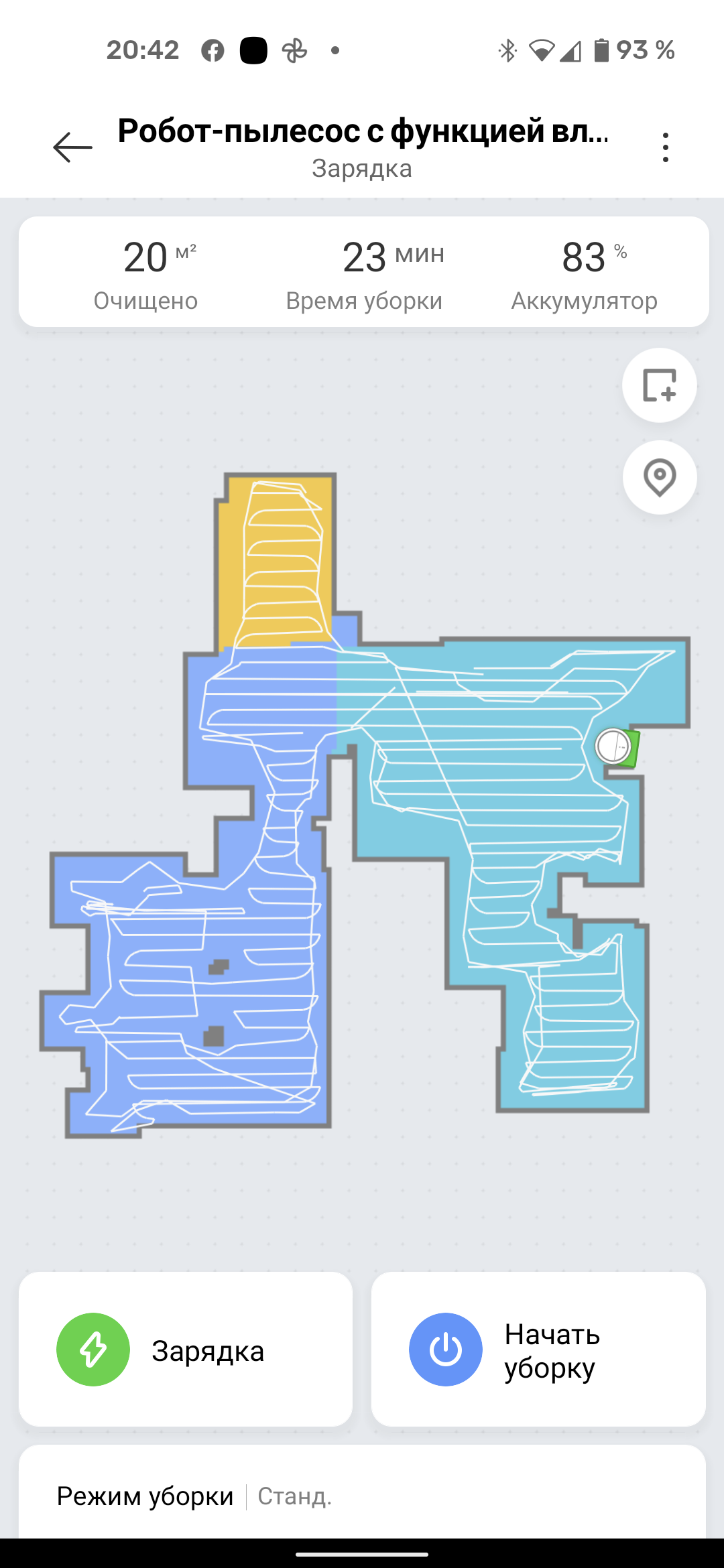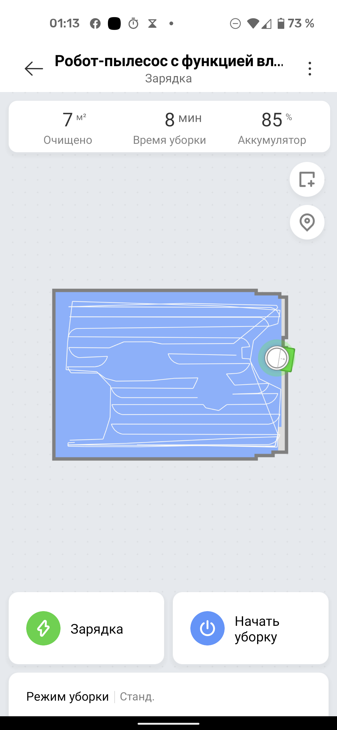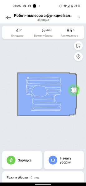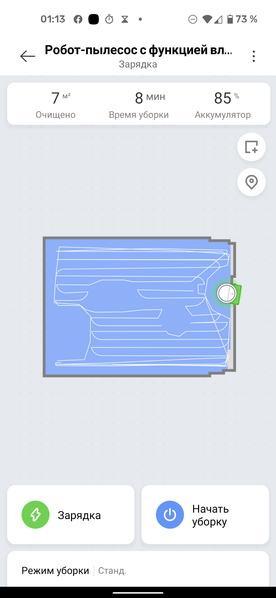 Достигнув уровня заряда в 20%, робот прерывает уборку и возвращается на базу. Полностью зарядившись, он возобновляет обход помещения с того же места, где прервался. Уборка не будет продолжена, если за время зарядки включился режим «не беспокоить».